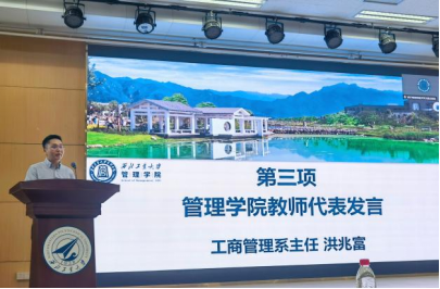 洪兆富作为学院教师代表发言。他强调,老师和同学们更像是合作者的关系。他结合自身经验给予研究生新生三点建议,包括转变思维方式、认同学校文化以及走出校园、时刻准备迎接环境变化所带来的挑战。