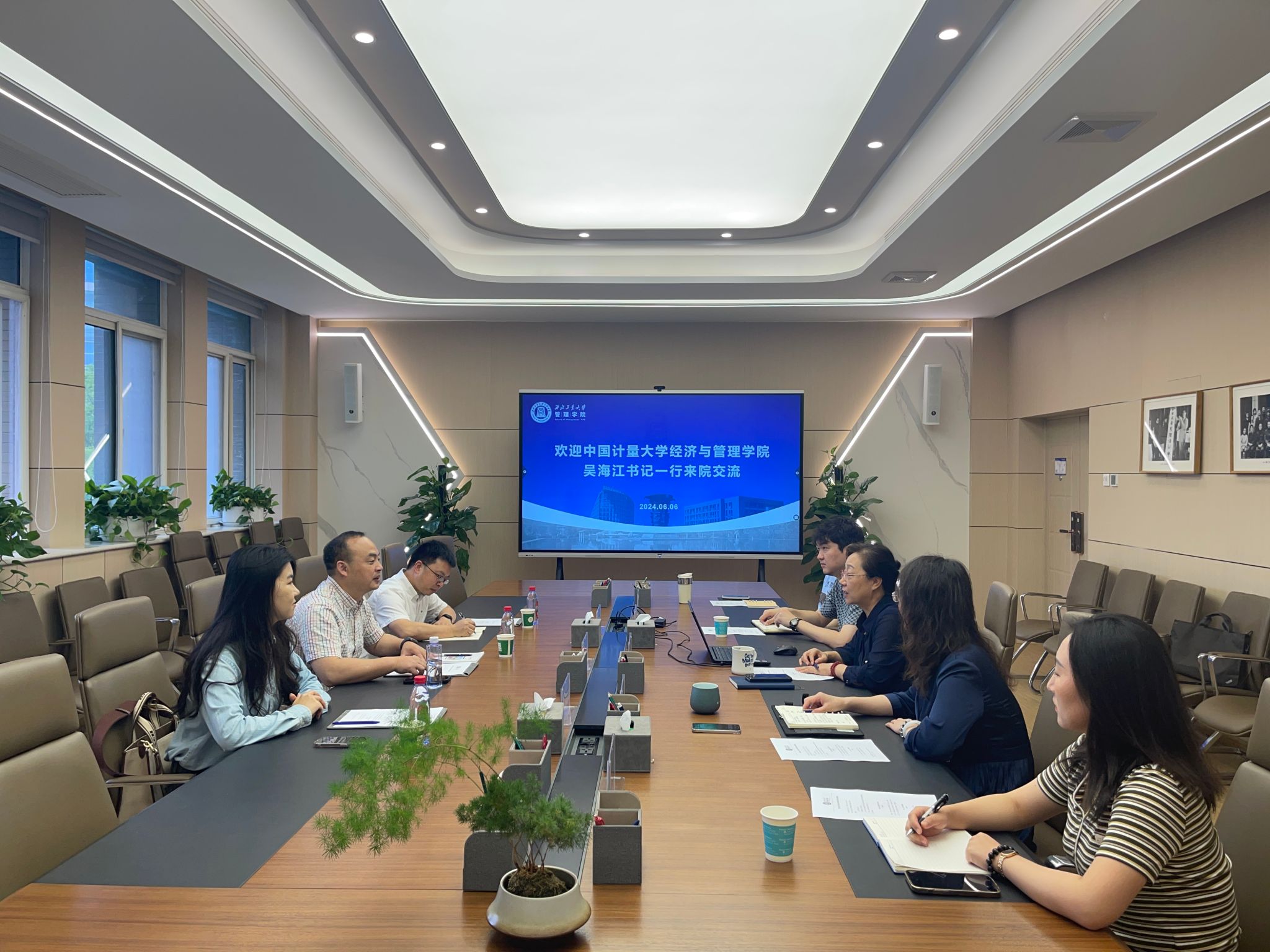 6月6日上午,中国计量大学经济与acg漫画 党委书记吴海江一行来院调研,双方在长安校区acg漫画 212会议室进行座谈。党委书记张爽、院长助理白洁等相关部门业务负责同志参加会议。