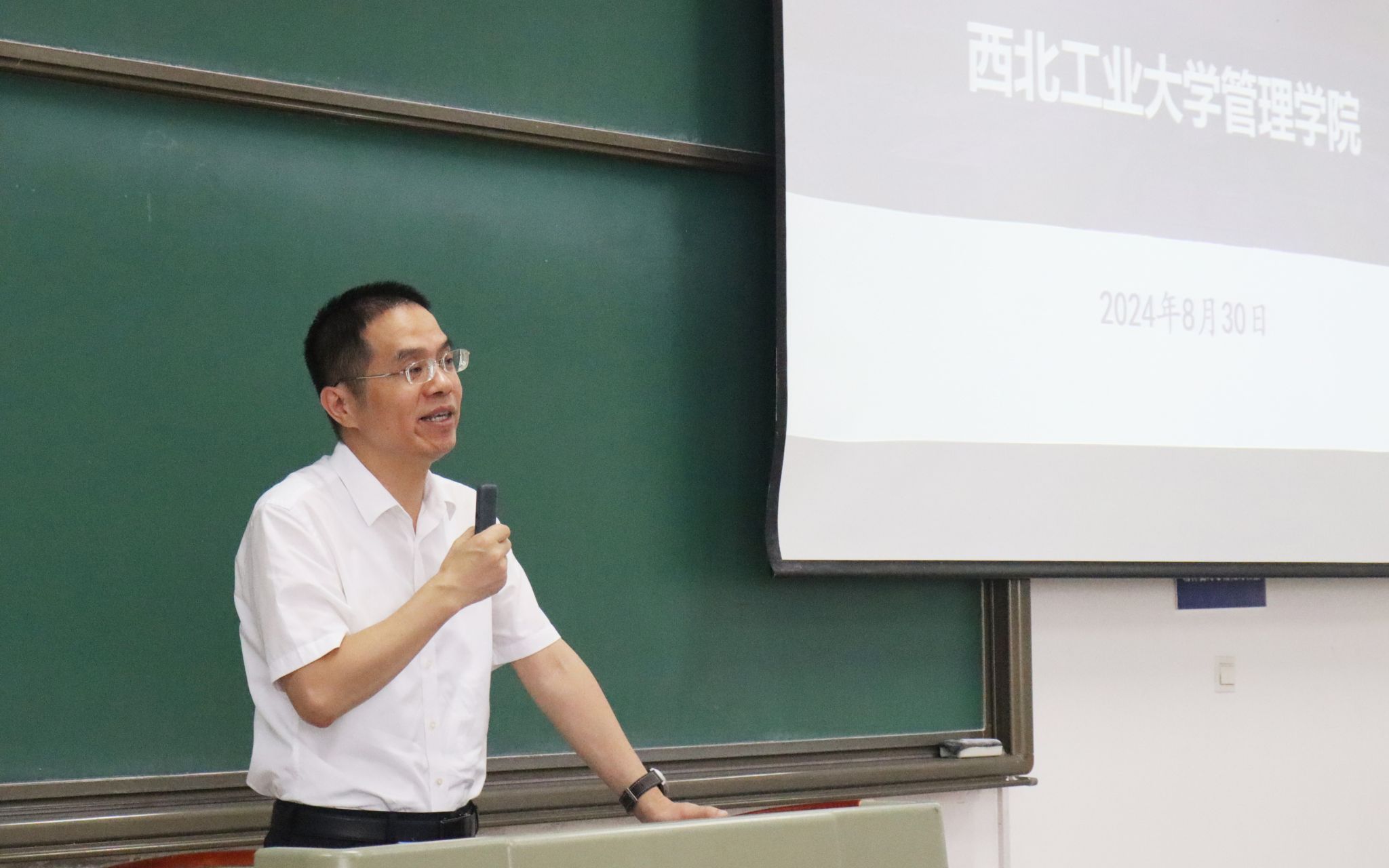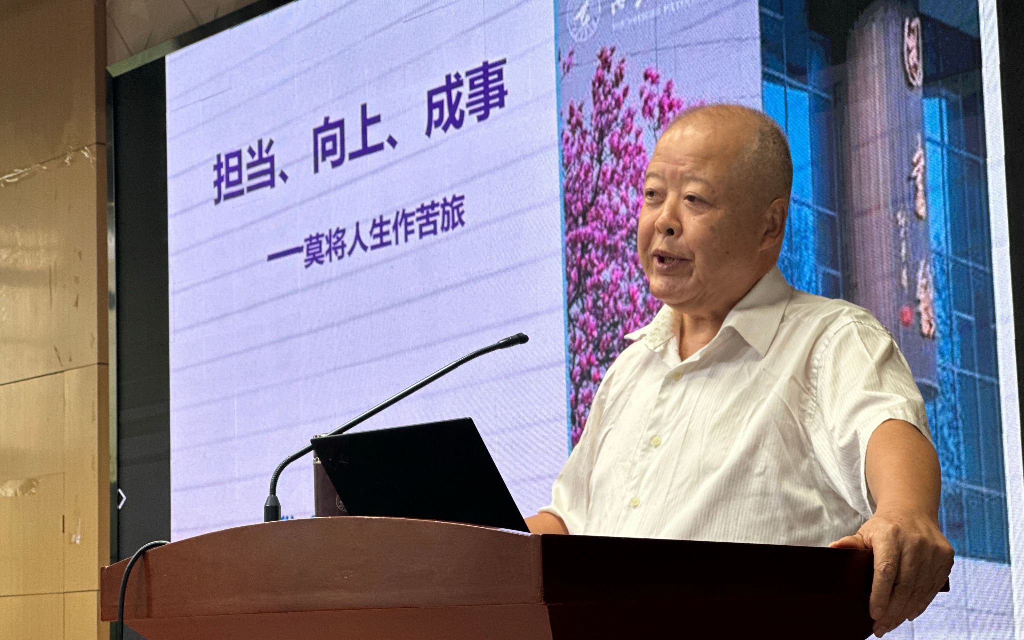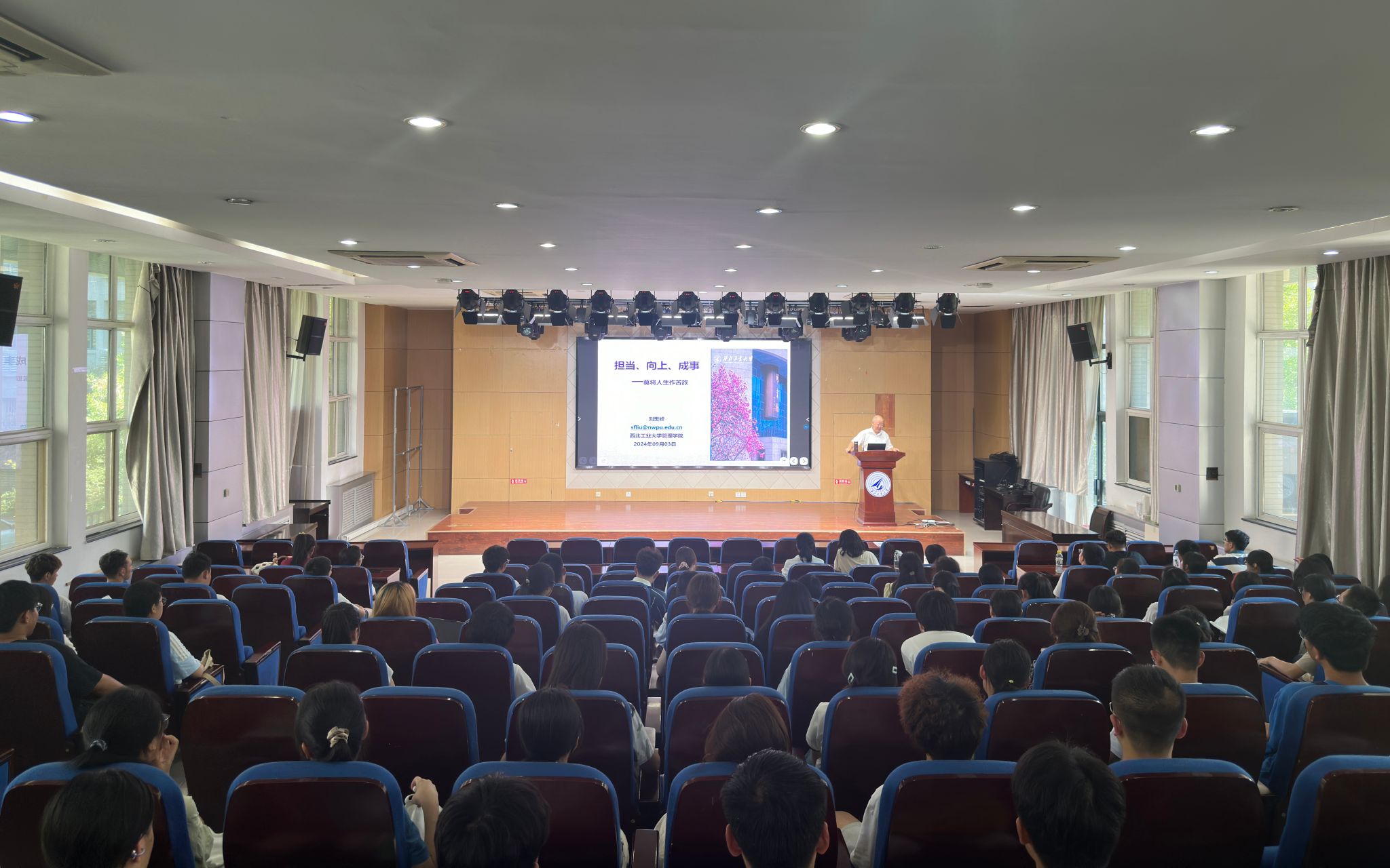 刘思峰教授以“担当、向上、成事”为题为新生们作报告。他以解读苏轼的词《临江仙·送钱穆父》开场,向同学们阐述了三种至关重要的处世心态:第一,无论何时何地,都应秉持积极乐观的心态;第二,要学会运用灰度思维来审视问题,并在实践中寻求价值的平衡;第三,他强调了“无私者成其私”的道理,即真正的无私往往能成就个人的长远利益。他鼓励同学们注重自我修养与提升,不断修炼来拓宽个人的视野与格局。