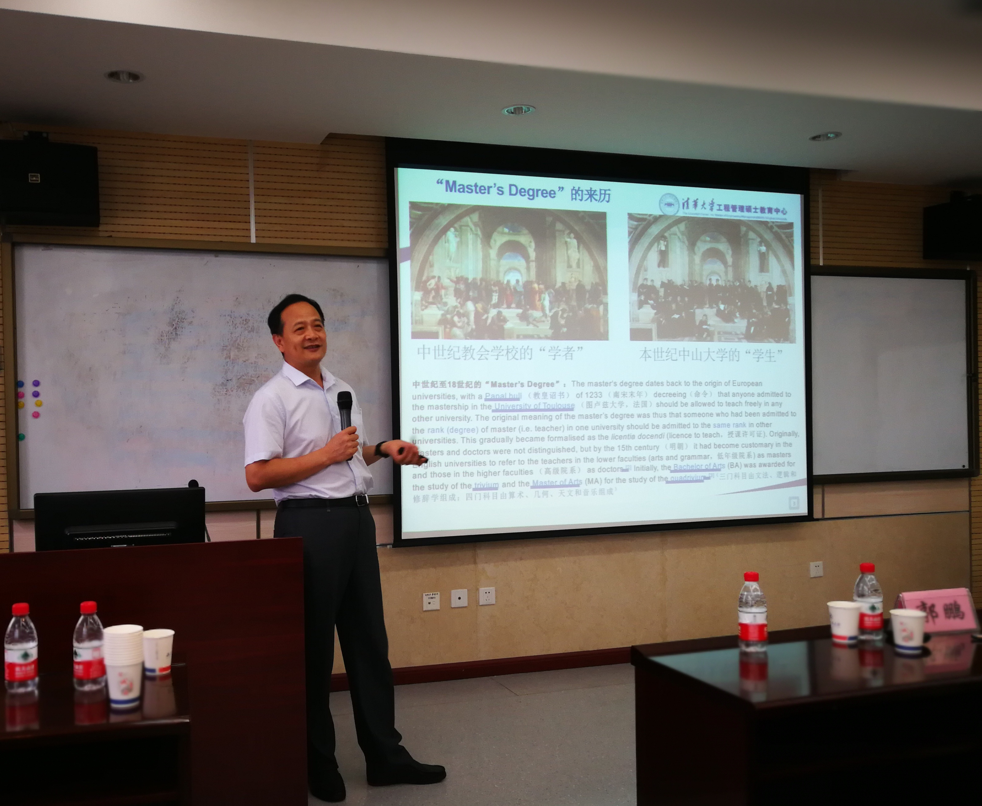 首先,张伟教授通过丰富详实的历史资料和大量的数据分析与比对,系统地梳理了研究生教育的起源、我国专业学位研究生教育及工程管理硕士专业学位产生的背景和发展历程及趋势,并对目前我国专业学位的学科布局做了说明和介绍,使与会老师对本科、科学学位硕士、专业学位硕士以及科学学位博士和专业学位博士各个层级的学位设置目的和培养要求有了清晰的了解和认识。张伟教授结合清华大学MEM学位论文指导改革的探索和实践过程,与大家分享了经验,分析和讨论了其中仍待完善和解决的问题。张伟教授谦和儒雅的个人气质、清晰严谨的思路和扎实的学科体系积淀给与会老师留下了深刻的印象。