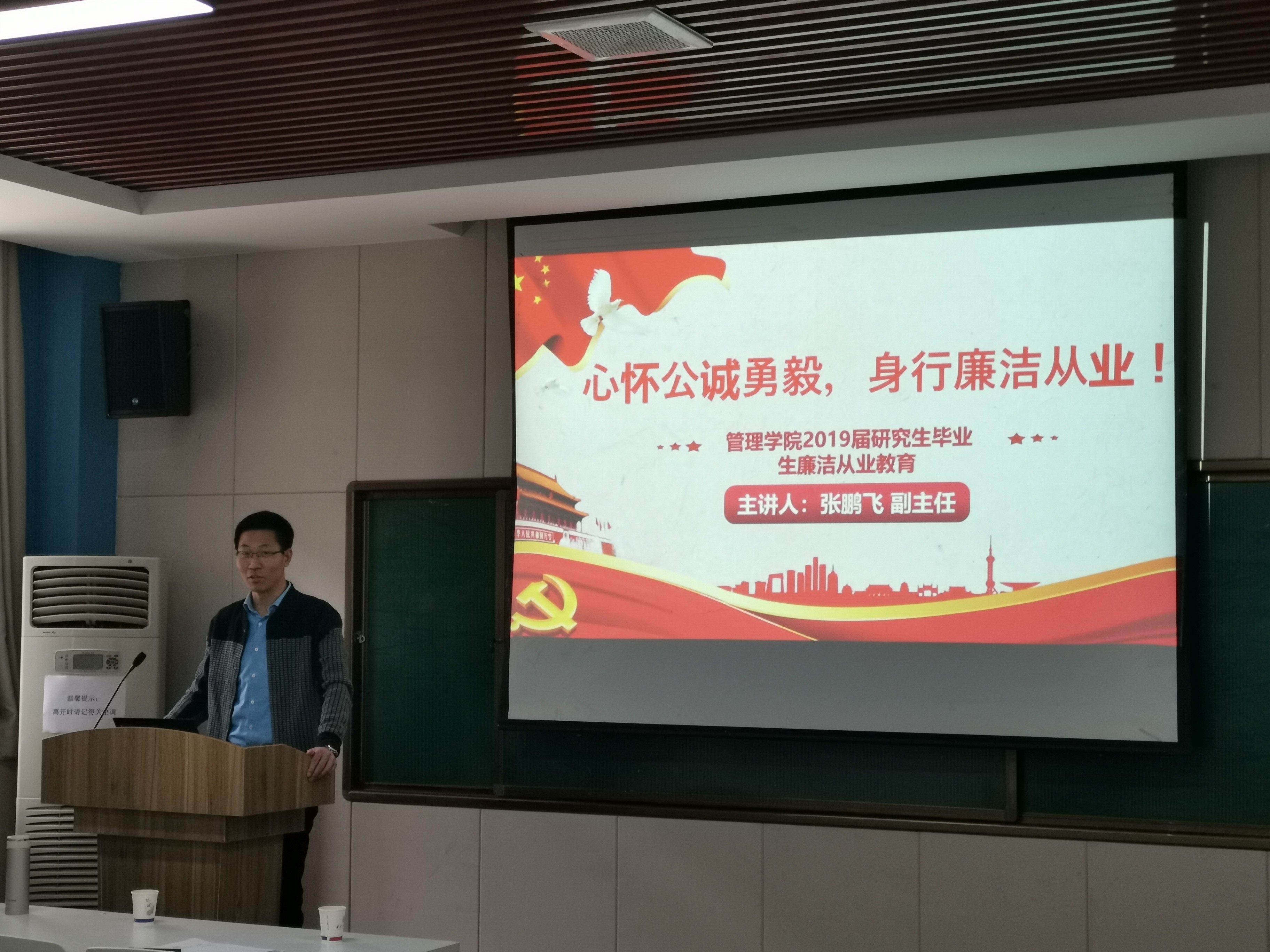 首先,曹子尧副书记对2019届硕士毕业生们圆满完成了学业、开启了人生的新征程表示祝贺。接着,纪委办副主任张鹏飞为全体毕业生进行了廉洁从业专题教育。他从以下几个方面向毕业生们强调了廉洁从业的重要性。一、切记党章中的三个准则,在生活与工作中遵守党章党规;二、纪律六大方面——政治、组织、廉洁、群众、工作、生活要时刻贯彻;三、介绍了监察法适用人员,涉及党员、公务员、国企人员等其他公职人员,强调切勿投机取巧,犯下大错。四、以“六个不得”再次警示同学们廉洁从业。最后,张鹏飞副主任对毕业生们顺利毕业表示祝贺,并祝愿毕业生们能够在职业道路上蓬勃发展,为祖国做出更大贡献。