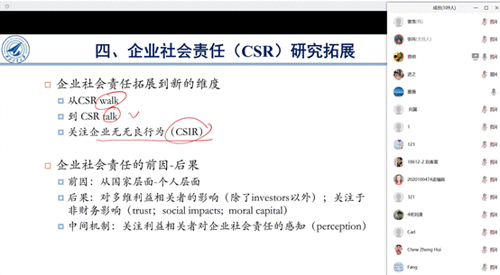 为博士生开设的前沿课程,由学院10多位教师来集体授课,每位教师介绍自己所在领域的研究情况。本学期则借网络授课的契机,尝试将授课与学术报告结合,改为公开讲座形式。计划未来每周安排两次报告,持续两个月左右的时间。本次讲座也是该系列报告的第一讲,学院贾明教授通过腾讯会议平台分享了有关企业社会责任研究的回顾与展望。报告会中,有来自各学校的本科生、硕士生、博士生以及教师一共109人参加了此次线上学术讲座。