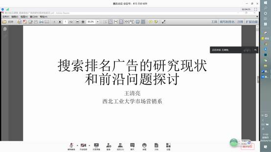 开展了《管理理论专题》系列报告第五讲,王清亮老师通过腾讯会议平台做了主题为“搜索排名广告的研究现状和前沿问题探讨”的报告。