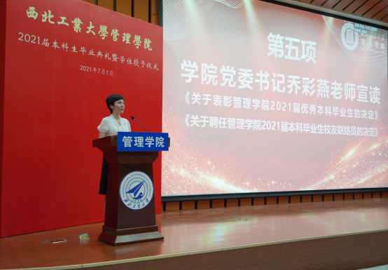 郭宇恒作为毕业生代表发言,他同大家一起回望了四载求学之路,并感谢学校及学院对自己的培养与栽培,他表示,离开学校后会继续身体力行,用实际行动践行身为西工大管院人所具有的时代责任与精神担当!