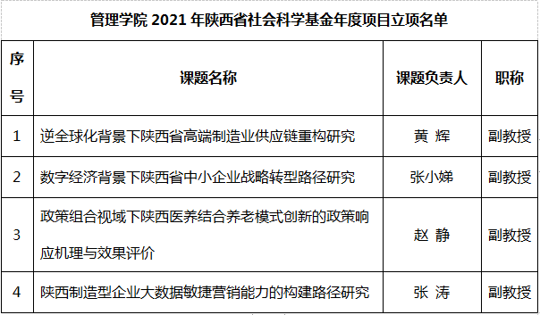 近日,陕西省哲学社会科学工作办公室公布了2021年度陕西省社会科学基金年度项目立项名单,全省共立项年度项目389项,立项率为16.5%。