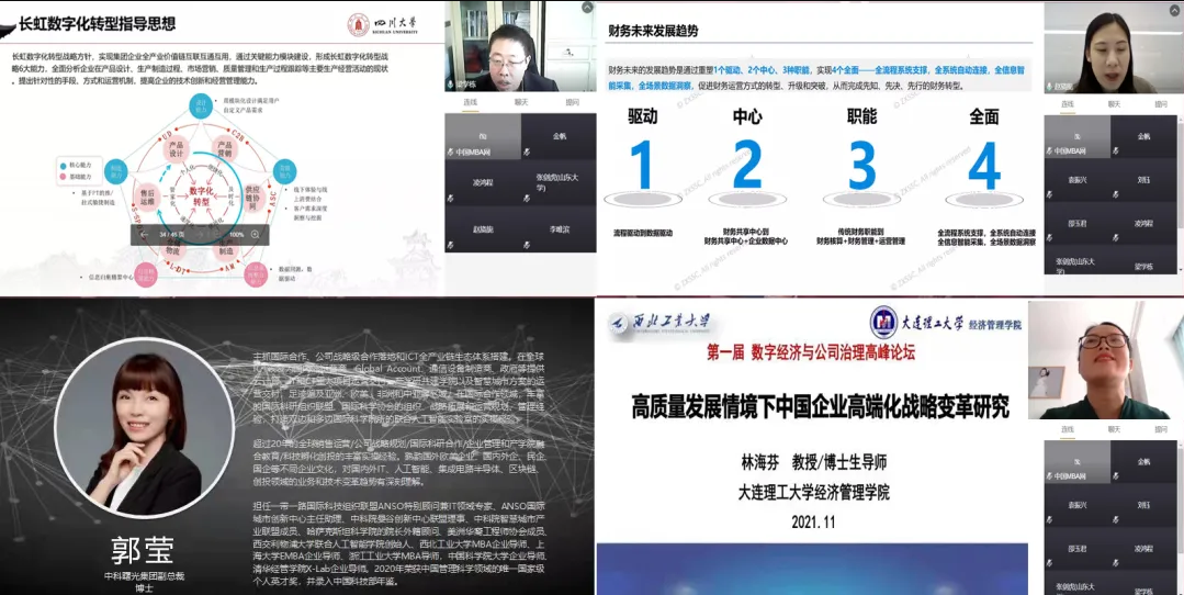 13日下午至14日下午举行了数字经济、公司治理和交叉前沿三个主题共五场平行论坛,分别由来自全国九所高校的十位院长、专家学者担任主持人。四川大学商学院教授梁学栋、大连理工大学教授林海芬、中科曙光集团副总裁郭莹、中兴新云服务有限公司副总裁赵旖旎分别作了《实体企业数字化转型理论与实务》、《高质量发展情境下中国企业的高端化战略变革研究》、《数字经济环境下的企业发展战略》、《DT时代的财务变革》等四场专题报告。在平行论坛中,来自全国数十个高校的论文作者进行了报告和点评,分享了在数字经济、公司治理及交叉学科领域的最新研究成果、观点和未来畅想。