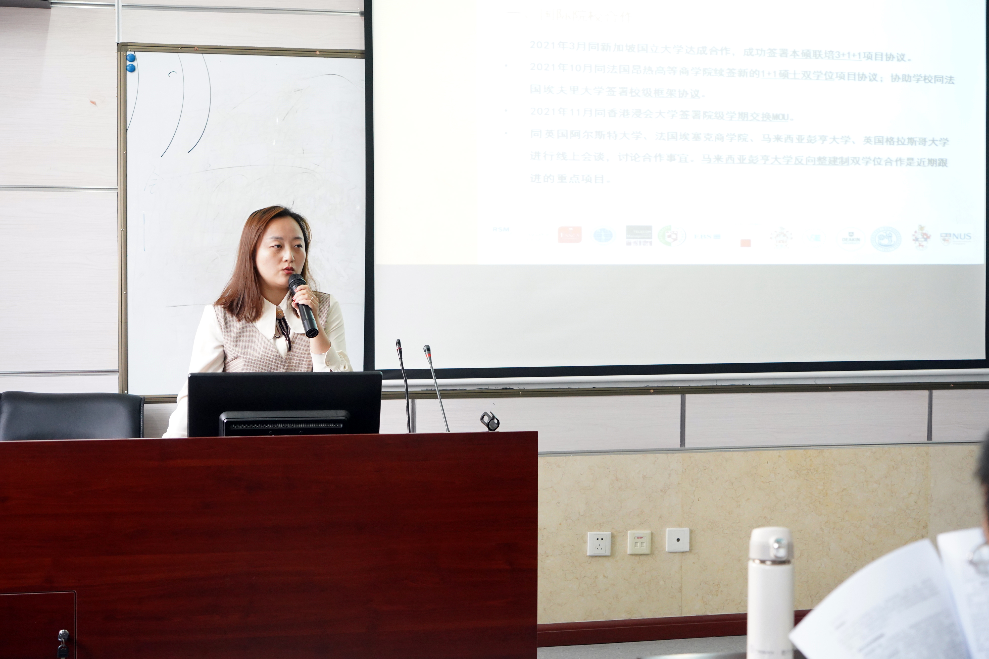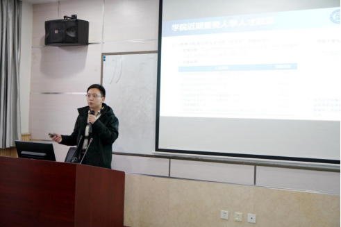 院长助理邵婧通报了今年以来学院国际化工作情况。院长助理李乘龙就学校、学院的人事人才政策进行了宣讲。
