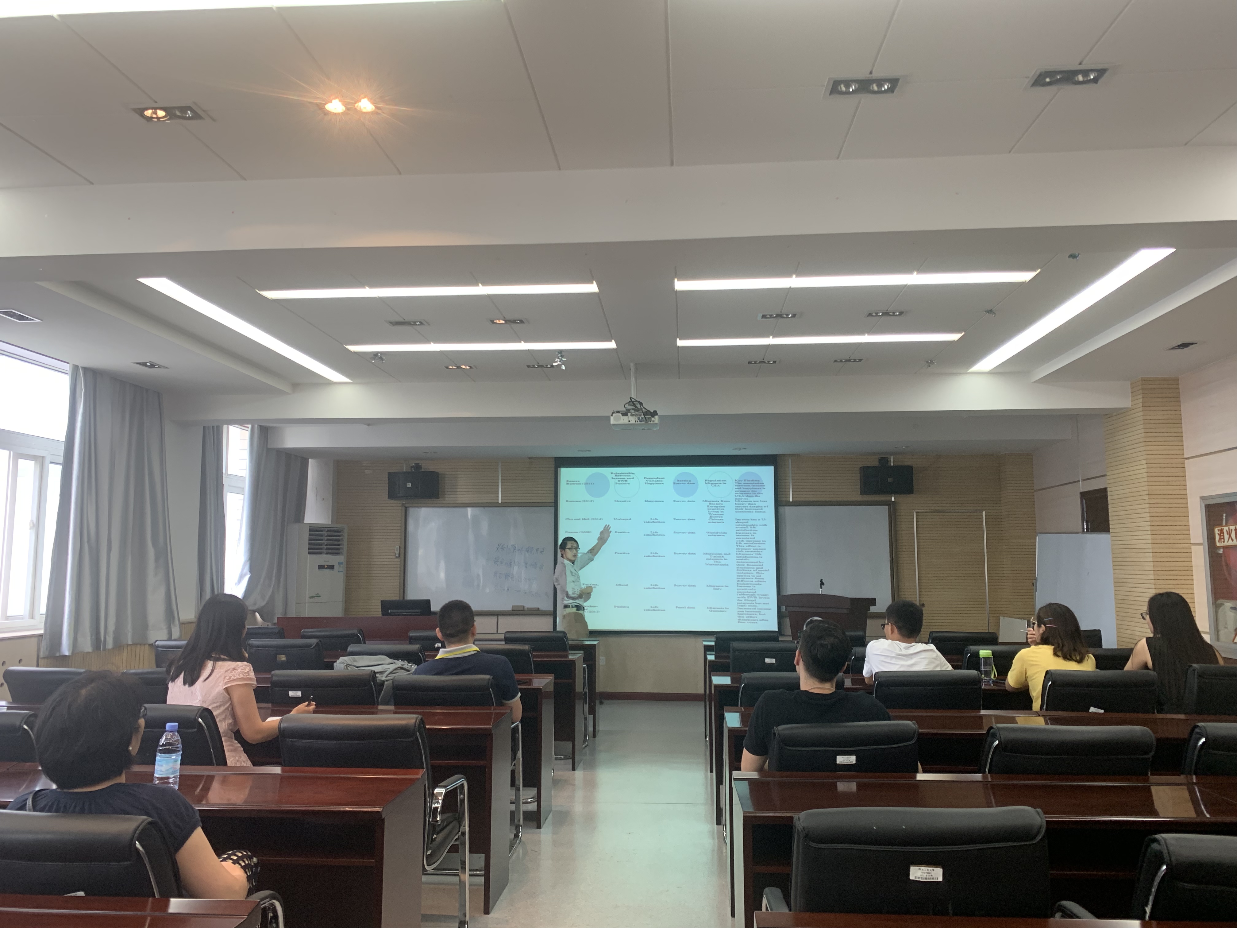 上午10点,杭海明副教授围绕国际移民的幸福感问题,讲解了国际移民为了建立归属感,可能会更多的购买物质产品,而不是经验和亲社会购买,对他们的幸福感产生负面影响,在增加幸福感方面亲社会购买比体验购买更有效。