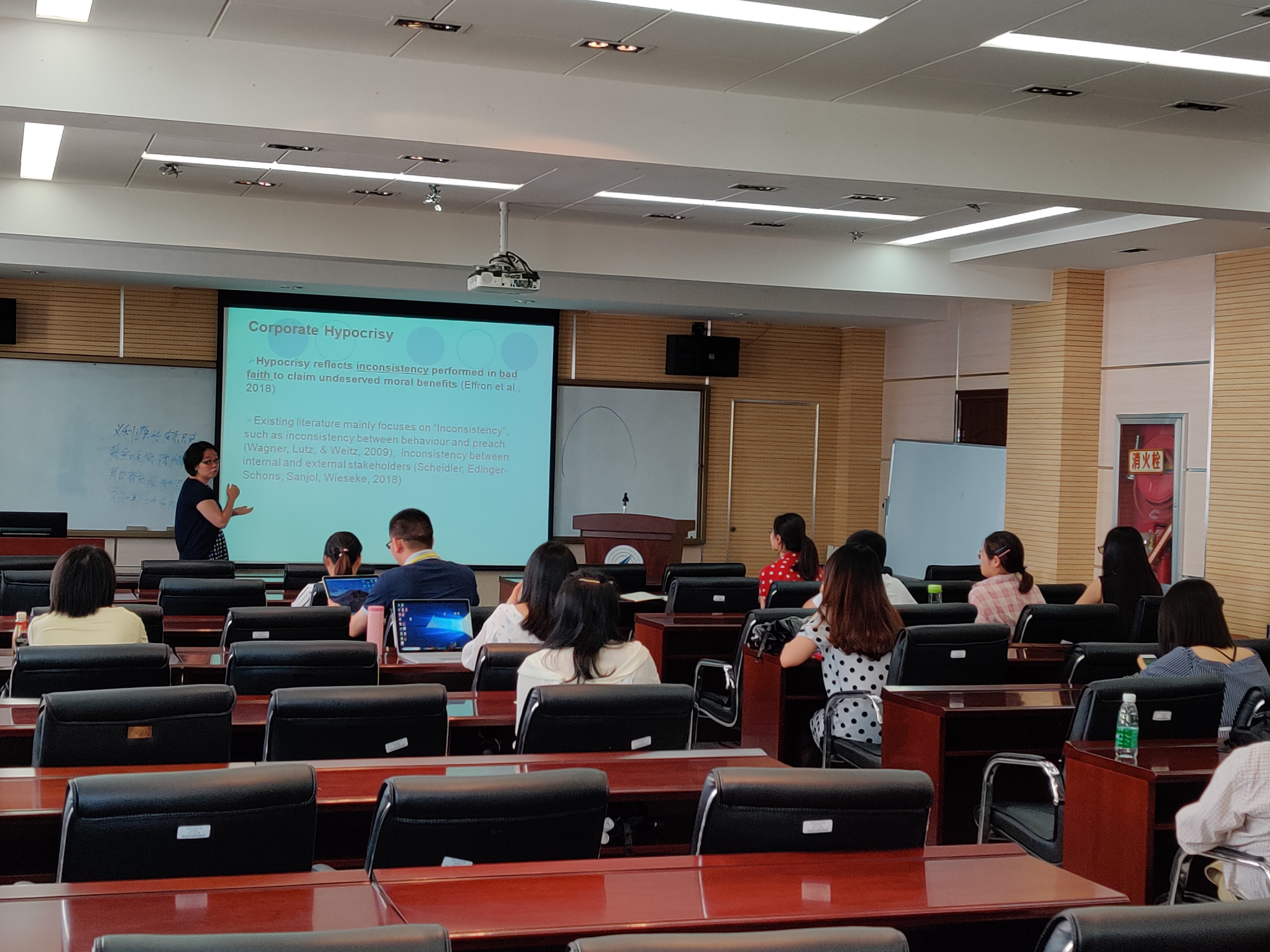 下午2点,陈之峰老师围绕企业社会责任,详细介绍了企业社会责任事件的先前记录是如何影响利益相关者在企业不良行为事件后对企业虚伪的看法。区分了企业的虚伪性和不一致性,讲解利益相关者对真正的企业社会责任动机推论的重要性,以及这种认知的来源。