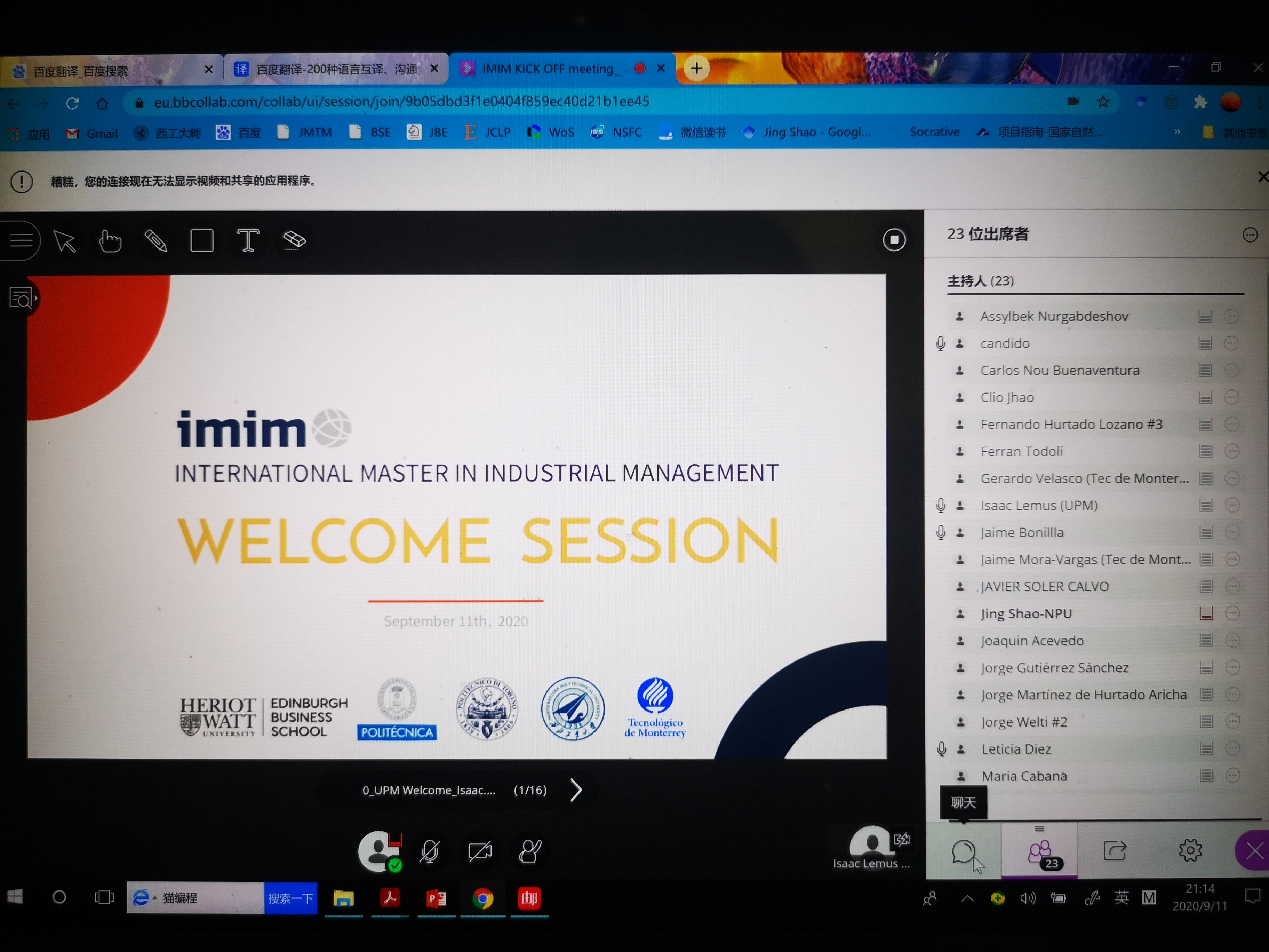 北京时间9月11日晚上8点,IMIM项目启动会准时召开,参与本项目五所合作院校的代表全部参会。会议首先由西班牙马德里理工大学工业工程学院的Isaac Lemus教授致辞,并向其他合作院校简要介绍了2020-2022年IMIM项目的实施情况。本项目面向全球招生,通过层层筛选,最终今年有11人入学,包括9名来自欧洲的学生和2名来自亚洲的学生。西班牙马德里理工大学的项目负责人Susana Moreno介绍了本项目的协议签署情况,包括项目协议、数据共享协议及学生协议。随后,西班牙马德里理工大学的Candido Barrena介绍了本项目的预算情况、硕士论文撰写规则等事宜。最后,由Isaac Lemus教授向大家作2021-2023年度IMIM项目的宣传计划,并公布了下一届学生的申请截止时间:非欧盟学生申请截止时间为2021年5月30日,欧盟学生申请时间截止为2021年7月31日。
