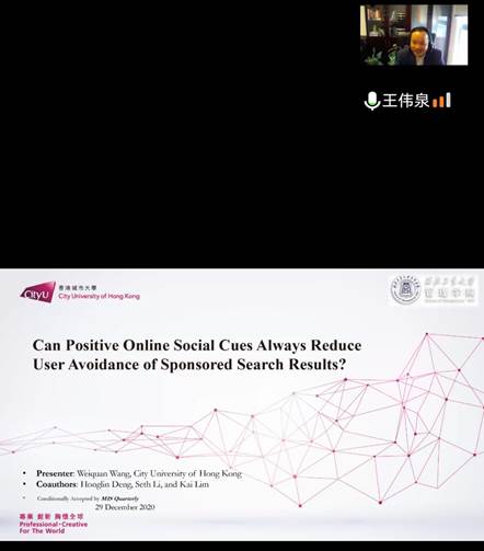 举行建院30周年系列学术报告会第二十七讲。香港城市大学资讯系统系终身教授、商学院副院长王伟泉应邀为管院师生作了“Can Positive Online Social Cues Always Reduce User Avoidance of Sponsored Search Results?”线上主题报告会。报告会由董雪艳助理教授主持,acg漫画