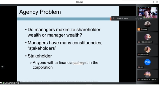 Giovanna Lo Nigro教授的《企业融资》课程以介绍公司财务领域的理论和工具为核心目的,课程主要分成“公司金融学”“融资市场与金融证券”及“投资组合理论”三大部分。从金融数学到投资评估,从利率、风险与收益率的关系到金融投资组合管理,从债券和股票评估到实物期权,通过Nigro教授对各类术语与理论的解释与案例分析,让同学们在本课程的学习中逐渐学会评估一个公司的金融结构并做出相应决策。在此次远程授课期间,Nigro教授逐一认识了每一位参加课堂的学生,鼓励同学们积极与老师互动,并在每节课后认真解答同学们在课程学习中遇到的任何疑问。