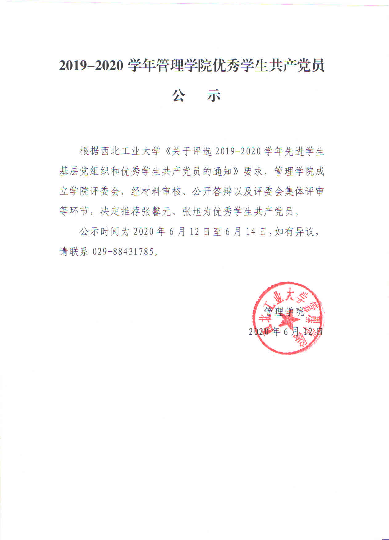 公示时间为2020年6月12日至6月14日,如有异议,请联系029-88431785。