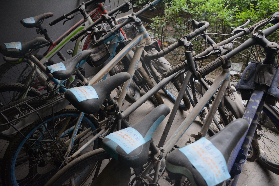 在校工作人员的引导下分区域完成废旧自行车的整理和搬运工作。