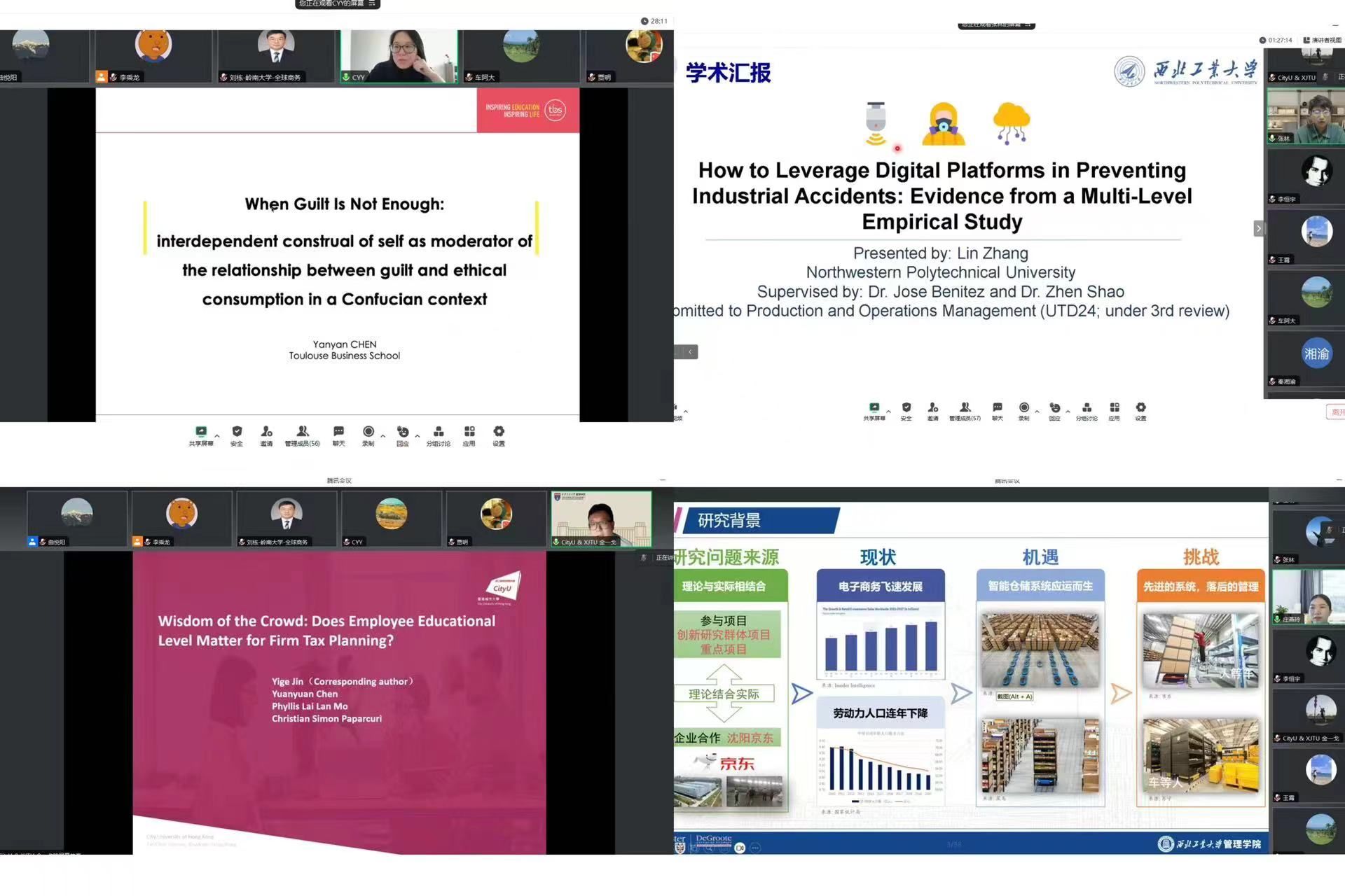 法国图卢兹商学院陈炎艳、香港城市大学金一戈、加拿大麦克马斯特大学庄燕玲以及学院新进青年教师代表张林四位青年学者依次作了题为“仁义礼道德观下的社会责任营销:依存型自我建构对于愧疚感与社会责任消费的调节作用”“Wisdom of the Crowd: Does Employee Educational Level Matter for Firm Tax Planning?”“机器人移动货架系统订单分批与排序优化方法研究”“How to Leverage Digital Platforms in Preventing Industrial Accidents: Evidence from a Multi-Level Empirical Study”的学术报告,参会师生围绕精彩的报告内容同报告人进行了热烈的探讨和交流。