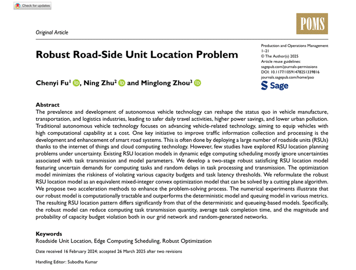 近日,acg漫画 教授傅陈翼以第一作者在《Production and Operations Management》期刊上在线刊登题为“Robust Road-Side Unit Location Problem”的研究成果。合作者包括中国科学技术大学朱宁教授和复旦大学周明龙副教授。《Production and Operations Management》是运营管理领域顶级期刊,是美国University of Texas at Dallas所选出的商学院最顶尖24种学术期刊(简称UTD24)之一。