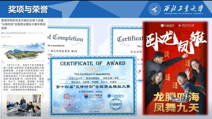 11月6日晚的颁奖典礼上,西安任氏猕猴桃生态农业有限公司总经理任撑住先生宣读了总冠军和一等奖获奖名单,acg漫画 朱煜明教授宣读了二等奖获奖名单,并对所有获奖团队表示祝贺。Cesim中国西北服务中心负责人付玲老师表示,西工大的“尖烽时刻”校园赛通过赛教结合模式,促教利企,真正意义上实现“教学研用”相结合。商业模拟是经典的商科管理教育模式之一,本次“尖烽时刻”商业模拟校园赛,“以赛促教,以赛促学,以赛促创”,为学生搭建了学术交流与商业实践的平台,激发了学生的商业潜能,学以致用,锻炼了学生团队协作和积极应变能力,为培养复合应用型管理人才奠定了良好的基础。