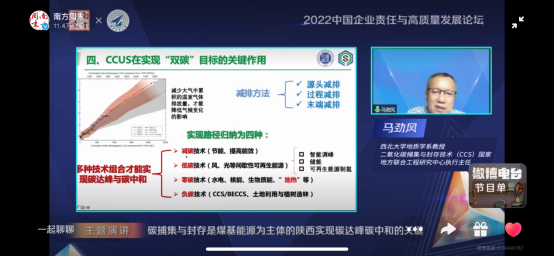 院长、北航低碳治理与政策智能实验室主任范英带来题为《面向碳中和的能源转型》的主题演讲,让我们能够看到碳中和愿景目标下,各类清洁能源的广阔市场空间;西北大学地质学系教授,二氧化碳捕集与封存技术(CCS)国家地方联合工程研究中心执行主任马劲风为大家报告《碳捕集与封存是煤基能源为主体的陕西实现碳达峰碳中和的关键》,分享了二氧化碳捕集与封存技术对减少二氧化碳排入大气的有效利用、还有通过大数据的分析总结,助力碳达峰碳中和等等,内容精彩纷呈,学术性干货满满;国网陕西电力科技数字化部副主任吴健分享《创新践行环境使命,彰显央企责任担当》,详细阐述央企如何履行社会责任,助力绿色发展。