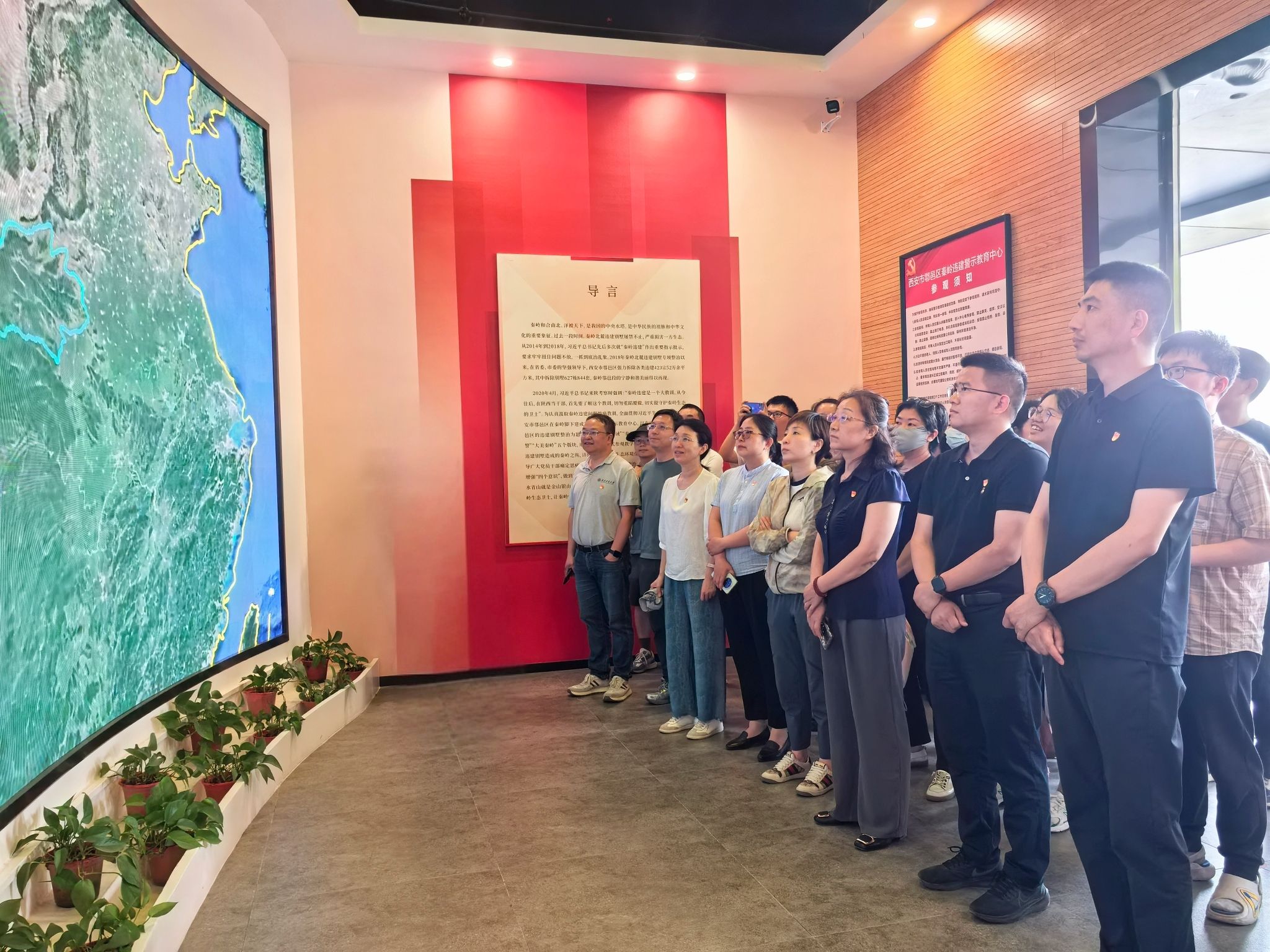 在讲解员的引导下,大家深入“一站三中心”,依次参观了“秦岭之诫”“秦岭之殇”“秦岭之治”“以案示警”“大美秦岭”五大展厅,重温了习近平总书记关于秦岭生态环境保护的重要指示精神,回顾其对秦岭违建别墅问题高度重视、亲自部署、持续推进、彻底整治的全过程。在秦岭保护智慧管控中心,大家近距离观摩了“空天地”一体化监测系统的实战演示,详细了解秦岭北麓专项整治的总体情况、生态修复的显著成效,以及“数字秦岭、智慧管山”的鄠邑治理新模式。