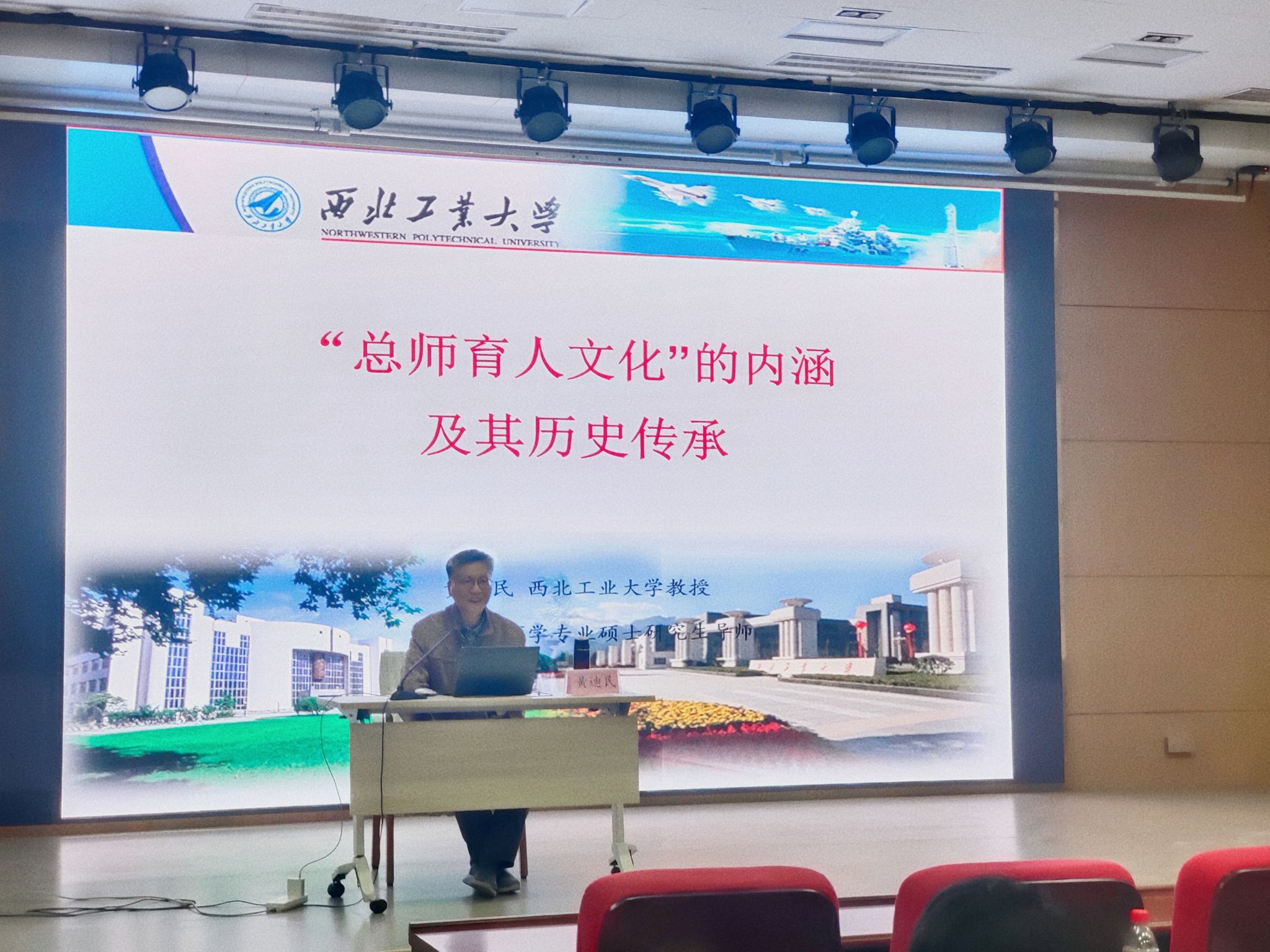 特别邀请学校“五老”宣讲团团长、校关工委“银发宣讲员”黄迪民老师,为120余名师生作题为《“总师育人文化”的内涵及其历史传承》的专题报告。