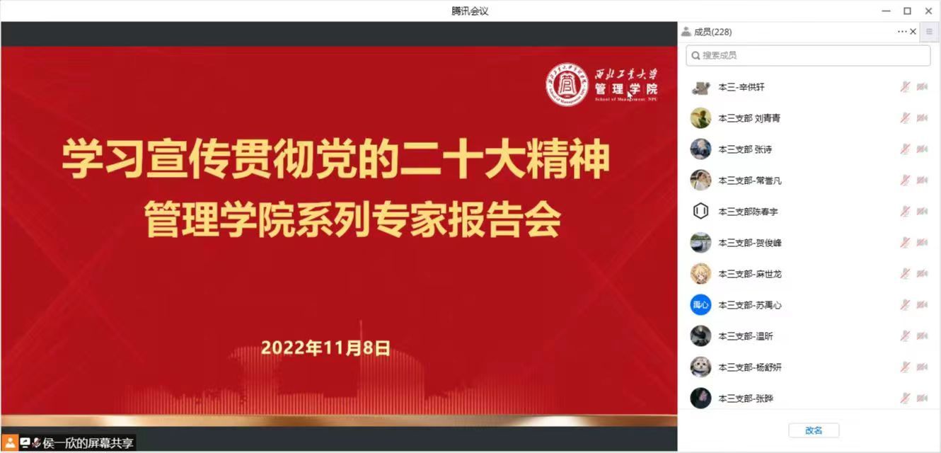 举行“学习宣传贯彻党的二十大精神”专家辅导报告第一期,邀请中共陕西省委党校侯建会教授作宣讲报告。学院全体师生党员参加了线上学习,报告由学院党委书记乔彩燕主持。