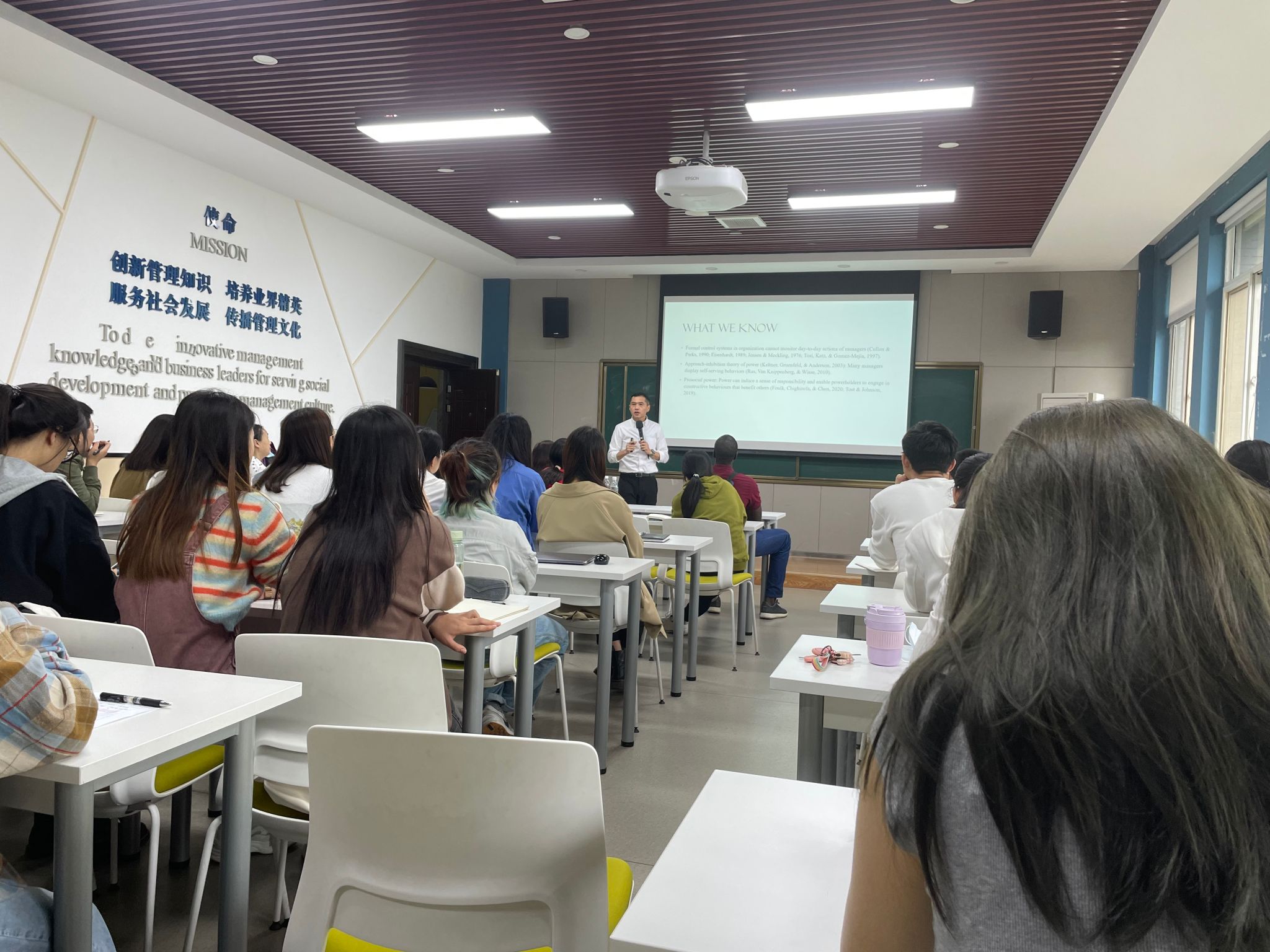 会上,黄旭深入讲解了目前正在开展的领导者诚信如何影响其下属及其他管理者的两项研究。黄旭从理论上探讨了上级领导的诚信会作为一种监督机制来规范下级管理者使用权力的观点,同时上级领导的高诚信水平可能会削弱管理者滥用权力的倾向。第二项研究,黄旭深入浅出地讲解了相比于低诚信水平的领导,高诚信水平的领导辱虐员工会给员工的自尊和绩效带来更强的负面影响。最后,黄旭对所做研究的学术贡献和现实意义进行了分享总结。