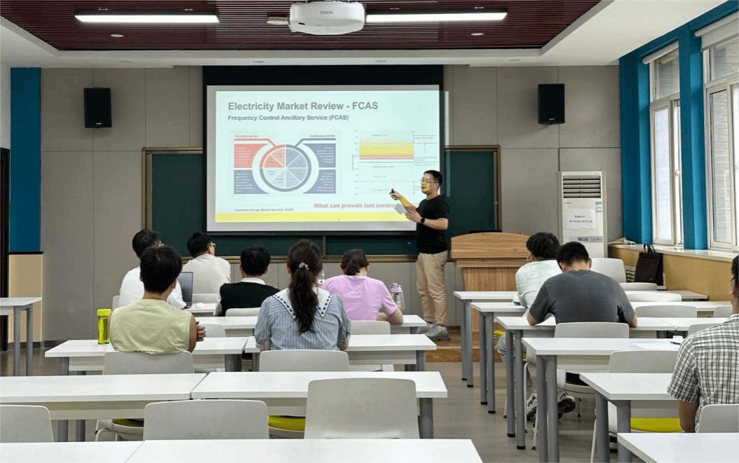 会议伊始,李乘龙对莫华东的个人情况、学术成果等进行了简要介绍,对他的来访表示热烈欢迎。在此次报告会中,莫华东介绍了澳大利亚电力市场的背景,特别是频率控制辅助服务(FCAS)的市场规则和投标模式。随后引出所构建的双层模型,包括两个部分:一是关于调整电池储能系统的投标策略,以最大限度地提高FCAS收入,以及二是调整国家电力市场调度引擎的购买容量,以最大程度地降低FCAS的总成本。莫华东详细分享了其团队所提出的解决方案,通过采用强化学习的方法来求解当前的双层模型,并另外介绍了两种正在研究中的加速计算新方法—量子强化学习和固定时间梯度动力学。