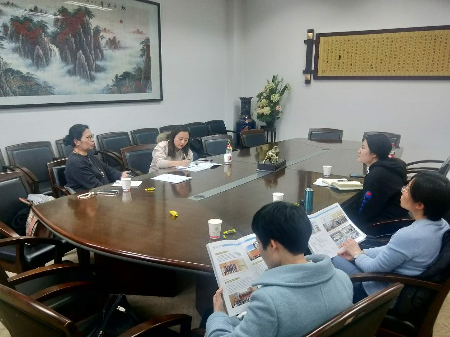 国际事务负责人邵婧老师、信管系钱艳俊老师、王娟茹老师和外事秘书王霄在学院231会议室与徐东溟教授就acg漫画