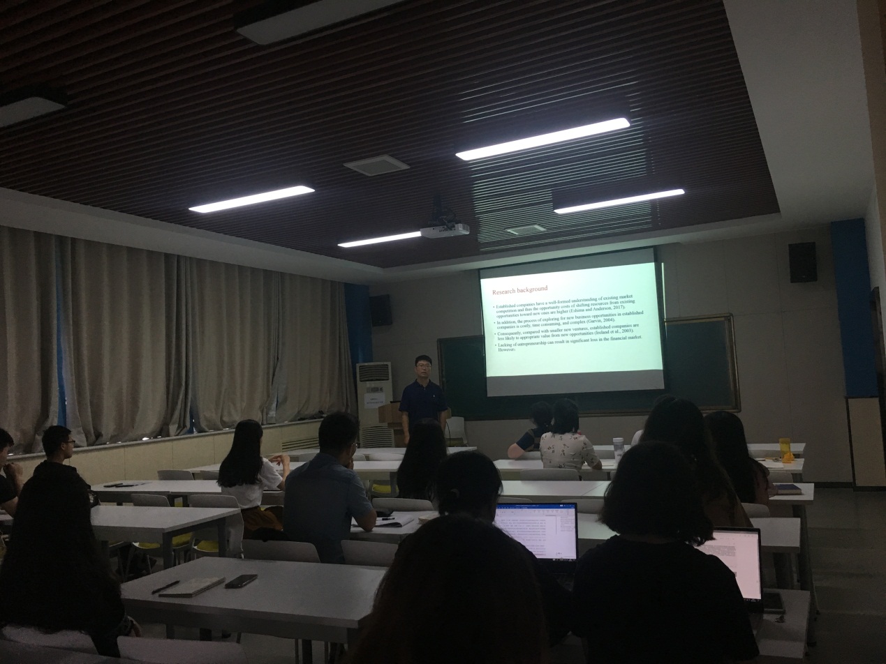王新春老师通过分享自己的博士论文向同学们细致地讲解了股票分析师对成熟企业创业导向的反应。从论文背景、数据收集、数据分析、理论贡献等几个方面向同学展示了论文的具体内容。报告过程中,王新春老师结合自身经历向同学们分享了发表论文的心得体会,从而与同学们进行了深入的交流。