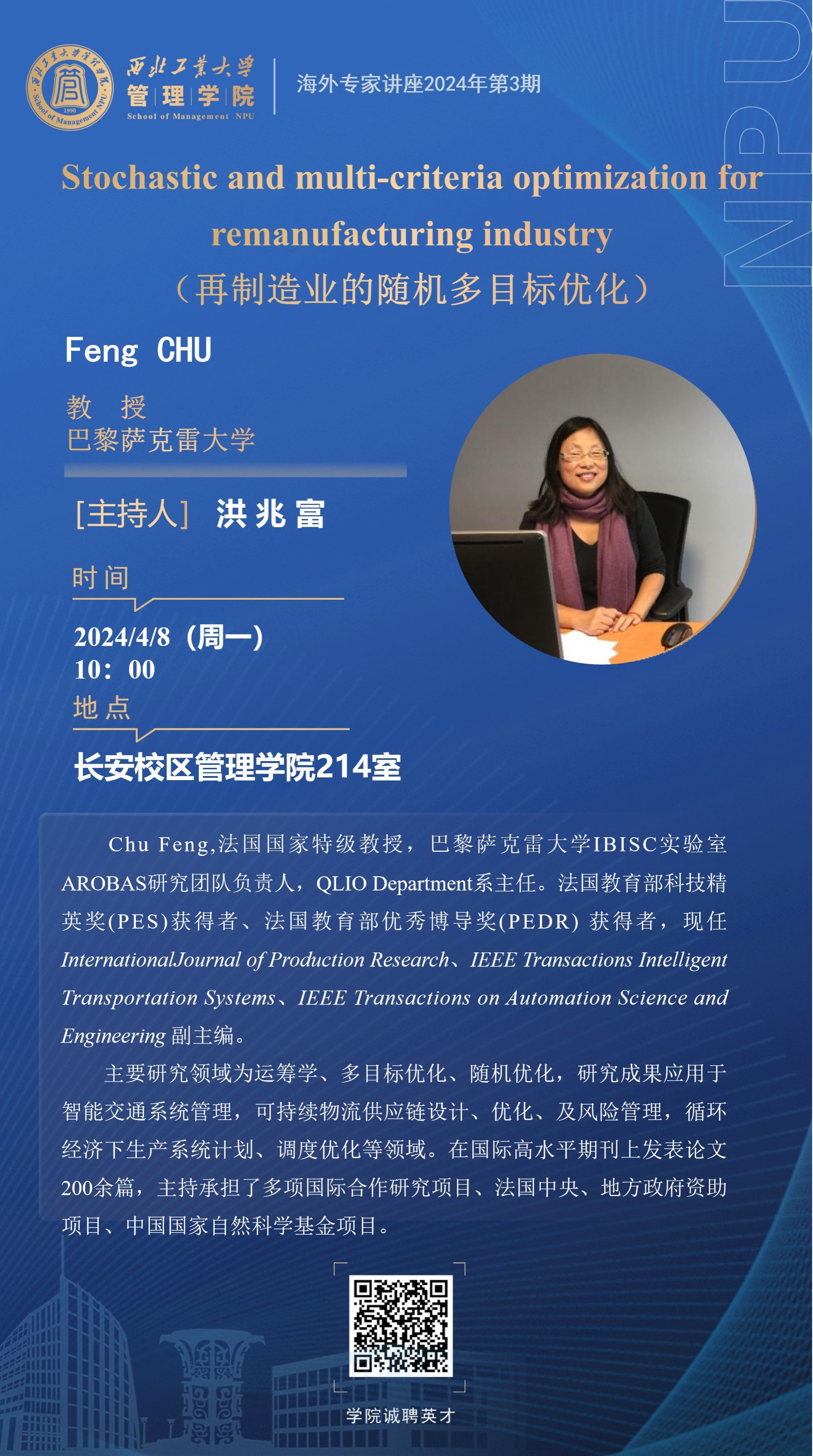 【学术报告】Stochastic and multi-criteria optimization forremanufacturing industry (再制造业的随机多目标优化)