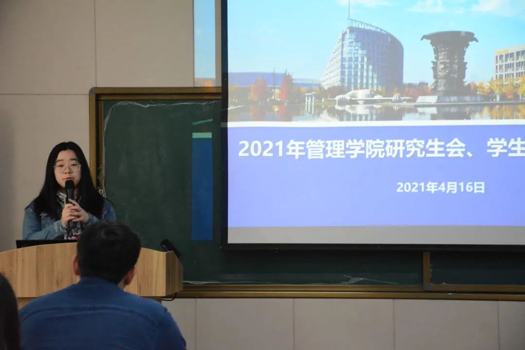研究生会主席团成员李国庆发言:“研究生会目前设有办公室、就业实践部、科学技术协会以及文体协会四个部门,定期召开全体大会、主席团会议,组织团建活动。上一年度,举办思想引领类、科研服务类、文体活动类、就业服务类活动共计21项。我们会做好机构精简,加强学院研究生队伍建设,争取学习资料和活动文档线上化,方便同学们有需自取。”