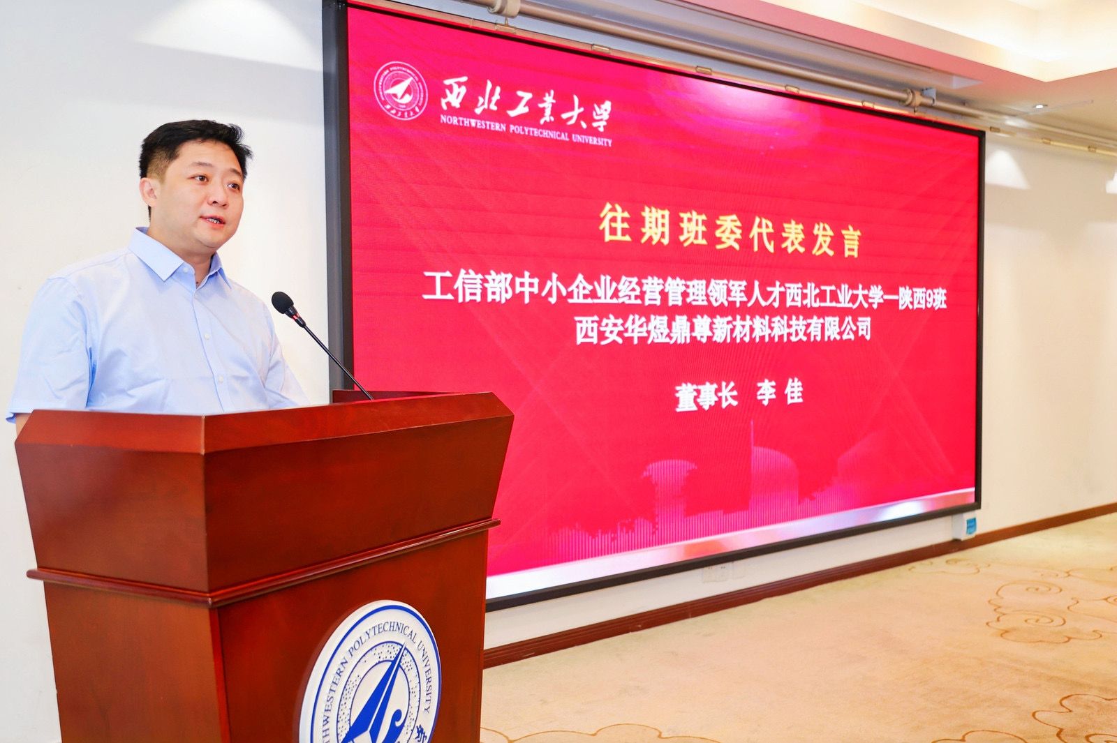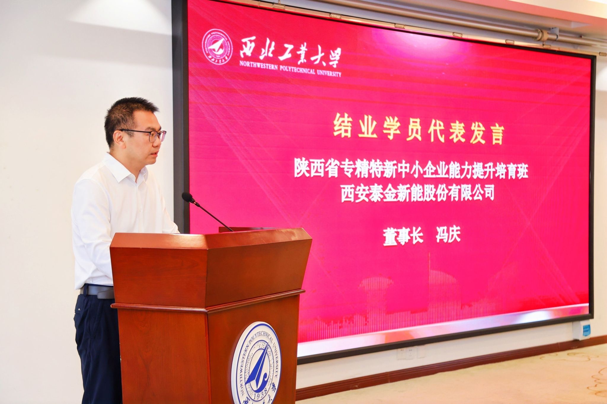 往期学员代表、领军人才西工大—陕西9班班长、西安华煜鼎尊新材料科技有限公司董事长李佳,结业学员代表、领军人才西工大—陕西10班班长、华鼎项目管理咨询有限公司副总经理李浩,专精特新培育班班长、西安泰金新能股份有限公司董事长冯庆先后发言。回首这段学习历程,大家收获的不仅仅是知识,更是一种视野的拓展、思维的提升和格局的放大。如何在变局之中开新局、在危机之中寻新机,是每个企业家都要面对的问题。结业不是结束,在未来的企业管理中学以致用,聚焦国家战略和市场需求,加强创新引领,加快形成新质生产力,形成产业链融合,以昂扬的精神状态、只争朝夕、埋头苦干,勇毅前行。