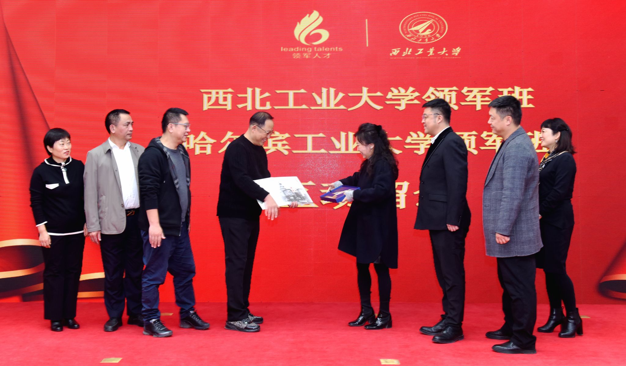校徽,西工大领军班、哈工大领军班互动留念,传承“聚是一团火,散是满天星,领军一家亲,全国有亲人”的领军精神和文化。