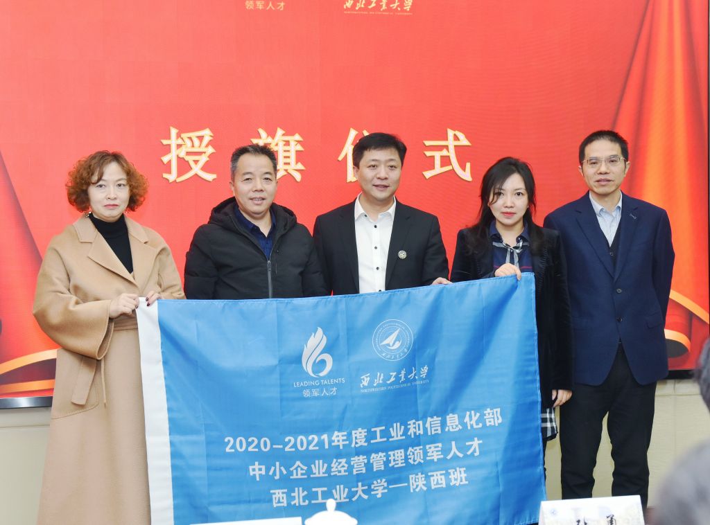 院长车阿大、陕西省工业和信息化厅非公经济处副处长李满弟向执行班主任李莹、刘放两位老师和新学员代表李佳授旗。