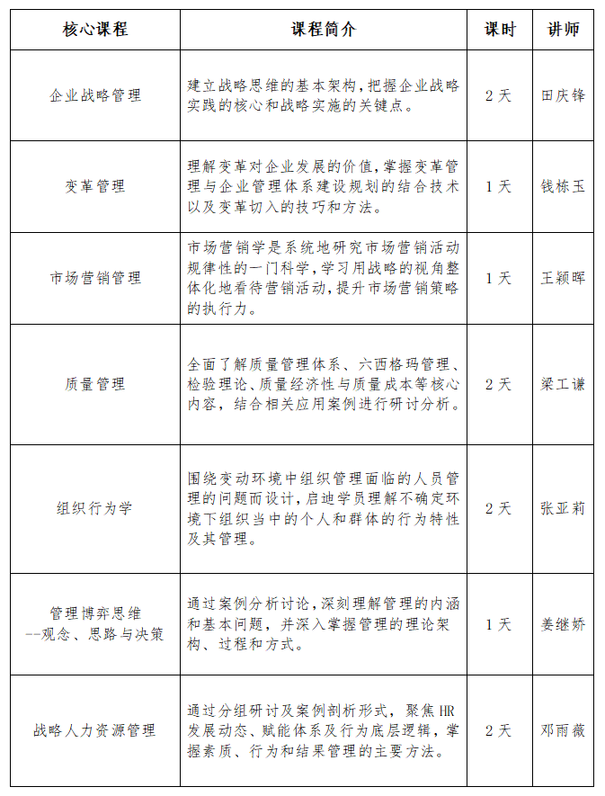 富有多年教学经验的资深教授为师资主体,同时邀请国内著名院校相关优秀教授、行业专家及企业导师等组成师资阵容,项目将以案例教学法为主,通过混合式学习,提升学习的实用性和内在整合性,旨在帮助学员将所学知识运用到实践中去,从而获得全新的管理视角,牢固掌握管理核心技能,灵活运用管理工具,解决企业运营管理中的实际问题,成为专业化可持续发展的复合型高级管理人才,助企业持续向前发展。