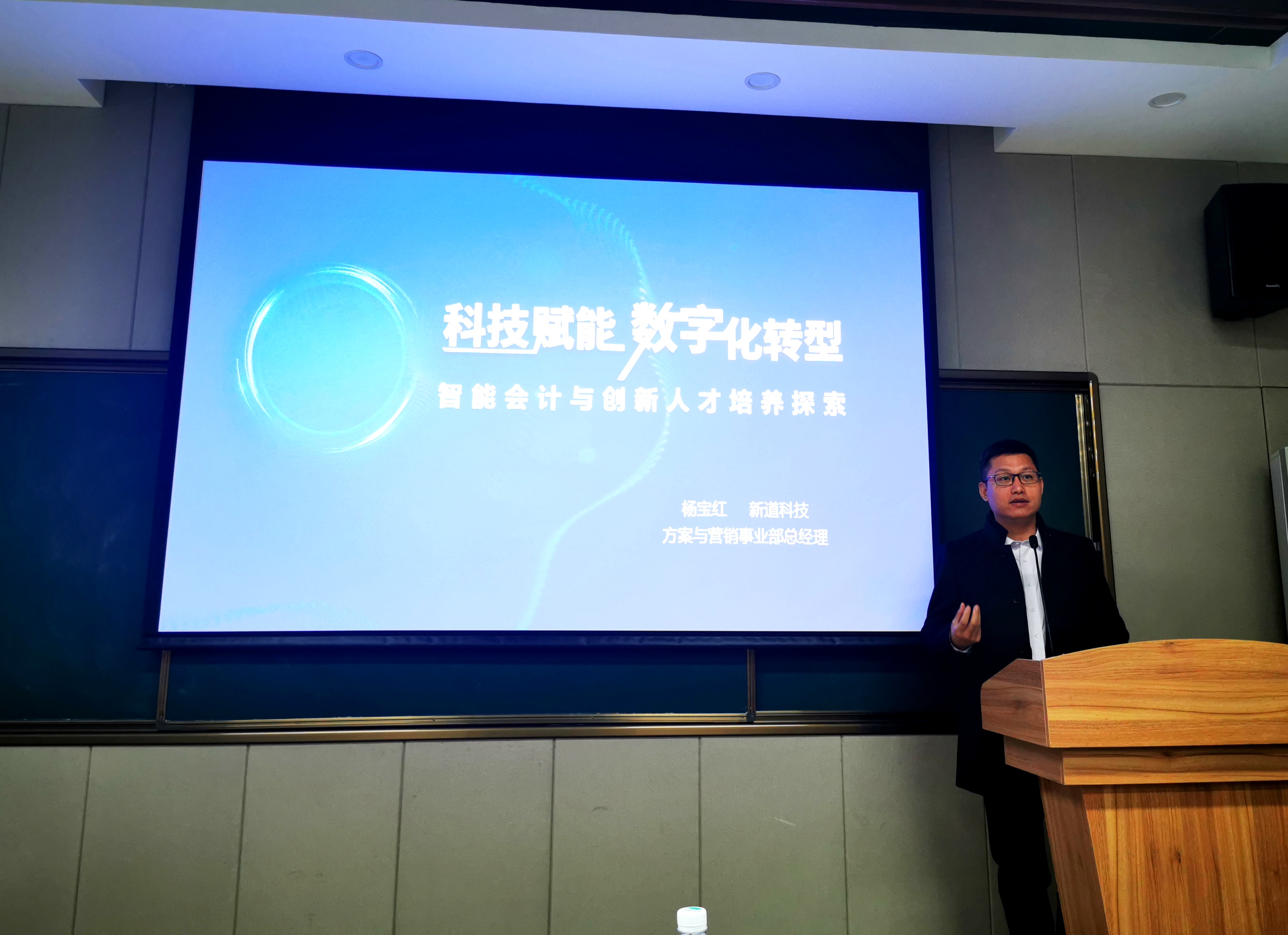 副院长田高良教授、中兴新云服务有限公司陈虎总裁和新道科技公司方案研究与营销事业部杨宝红总经理分别作了主题演讲。