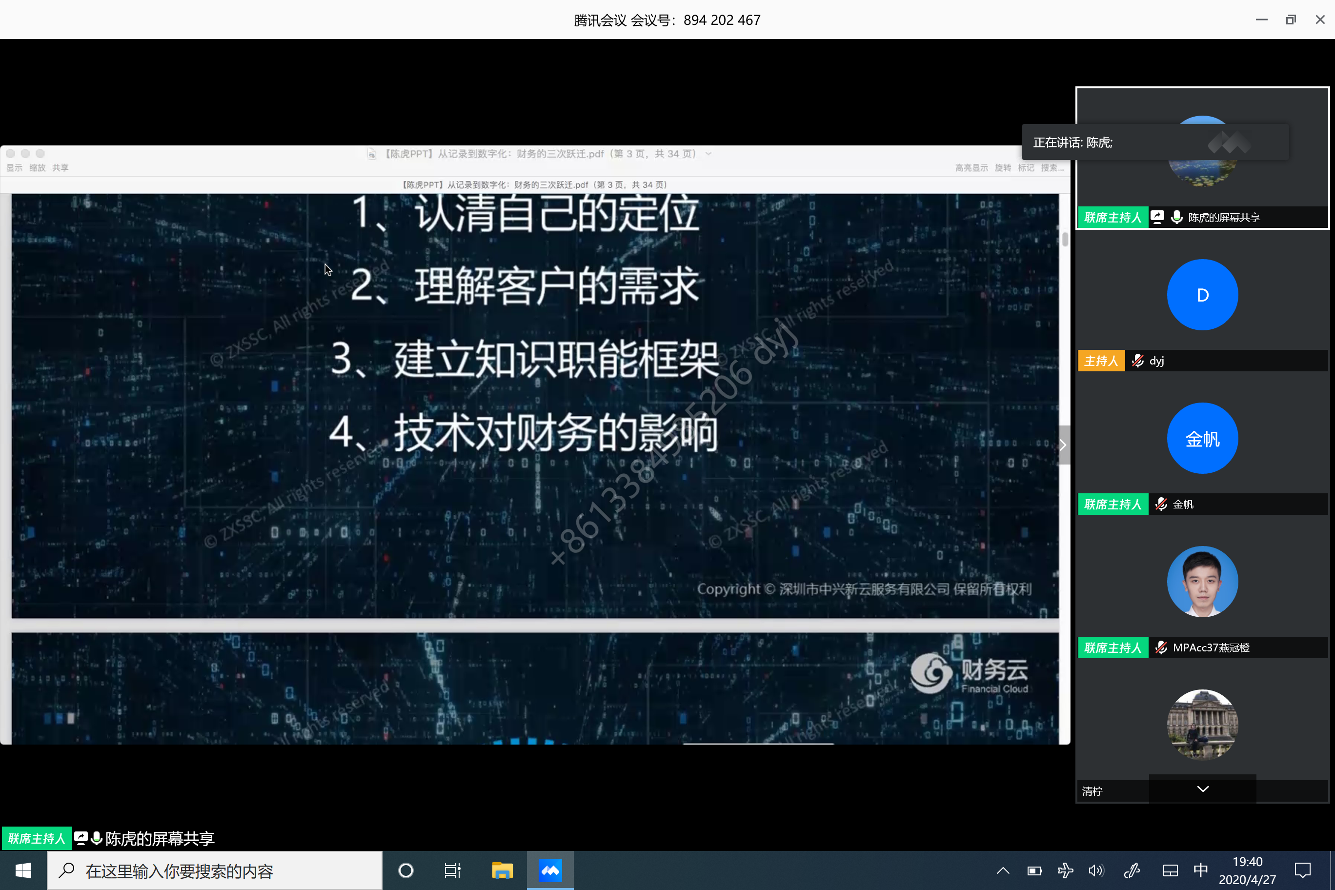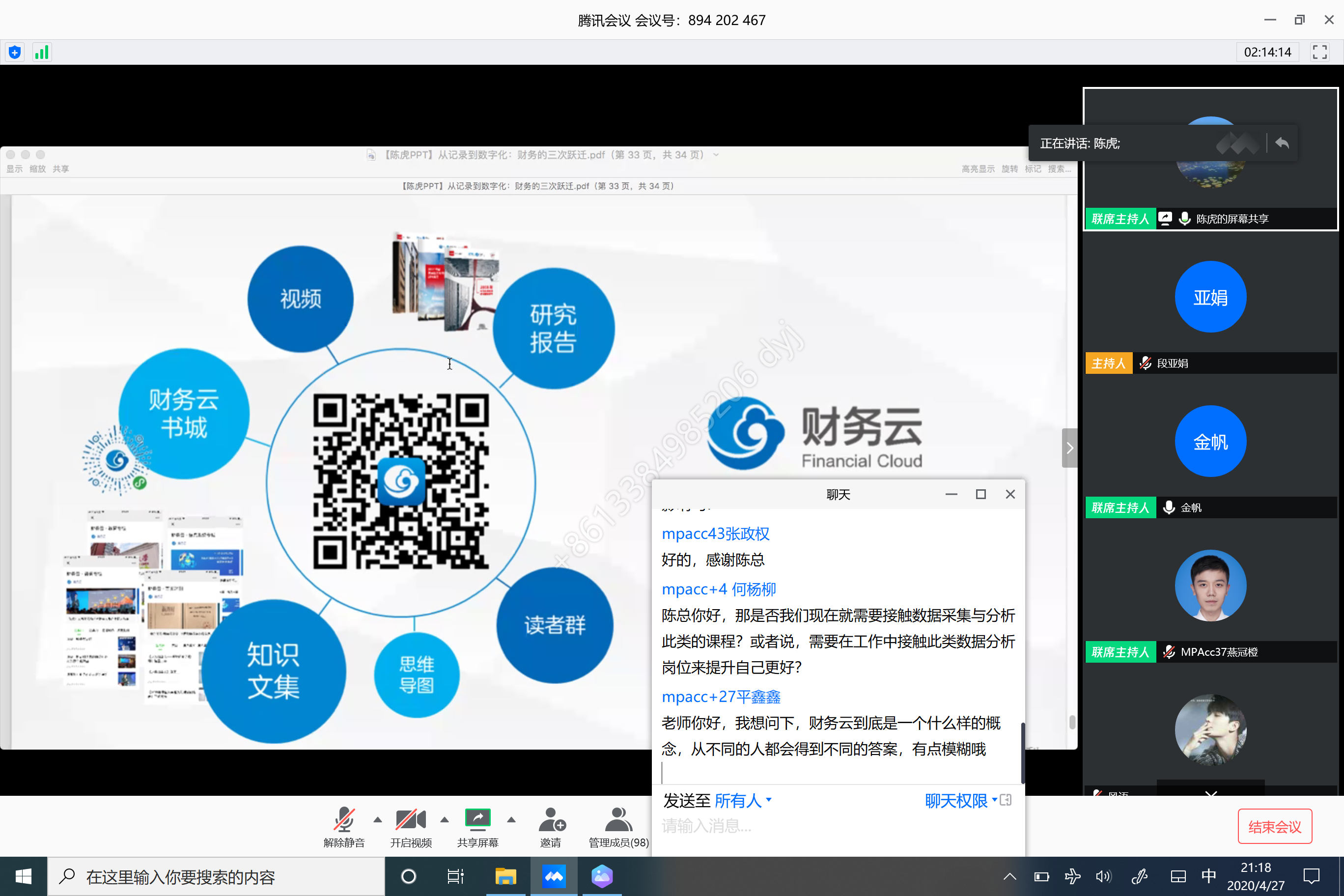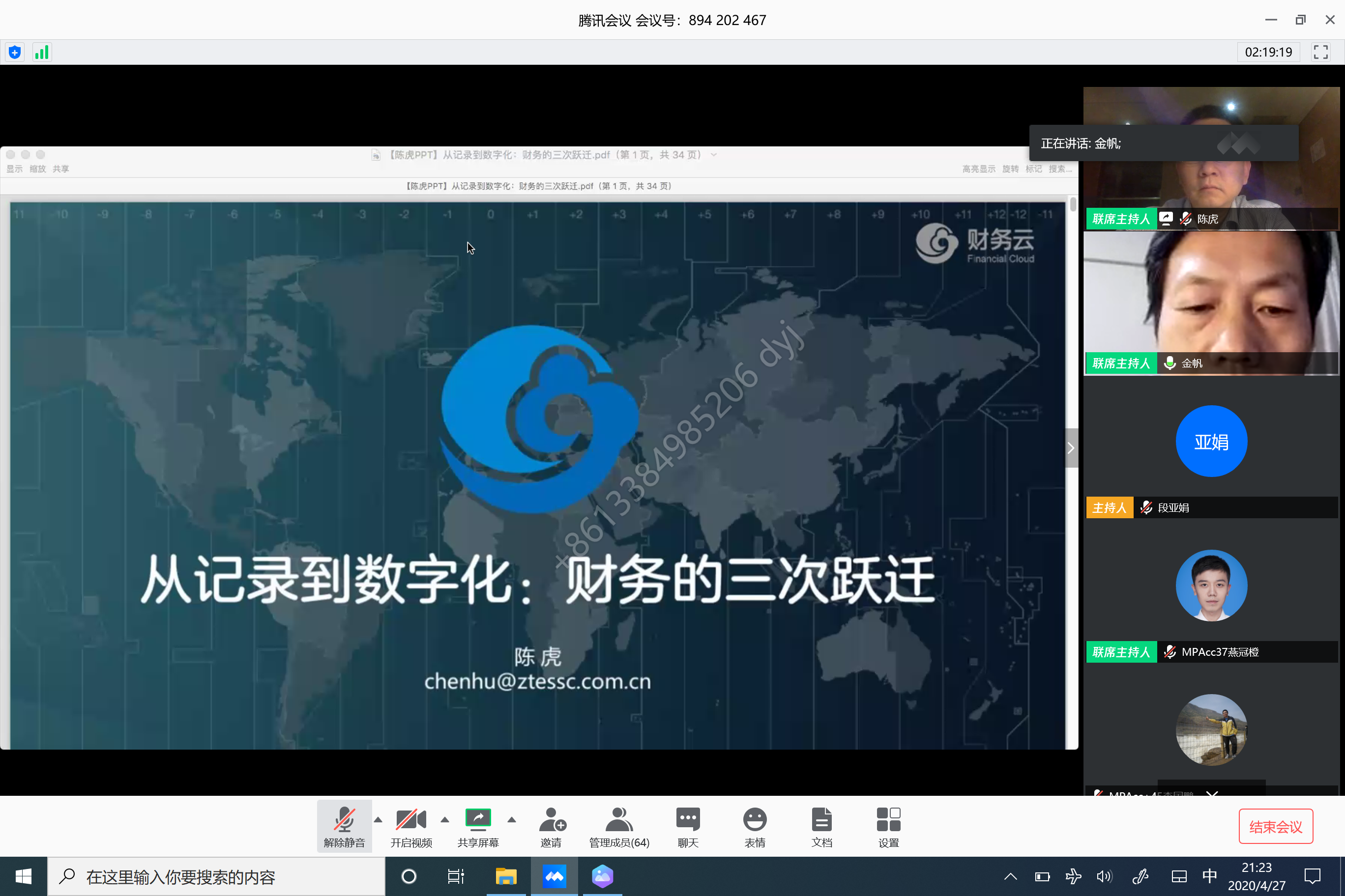 特邀中兴新云服务有限公司总裁陈虎先生采用腾讯会议平台为学院师生做了题为“从记录到数字化:财务的三次跃迁”的讲座。本次讲座由MPAcc教育中心主任金帆副教授主持,共有MPAcc、EMBA、MBA等一百多名专业学位研究生和学院部分教师进行了在线聆听。
