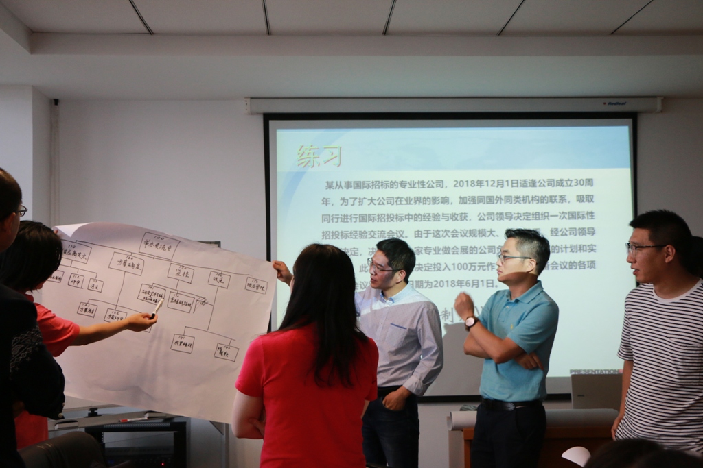 在小组案例研讨环节,20名学员通过抽签随机组成三个项目组,各项目组抽取案例题目,选定项目经理,按照擅长的领域进行分工合作。从上午8点到下午5点半,各项目组热烈讨论,多次修改、调整方案,模拟演讲。随后,三个项目组依次展示案例研讨报告,两位评估师对各组的表现进行了点评和总结。