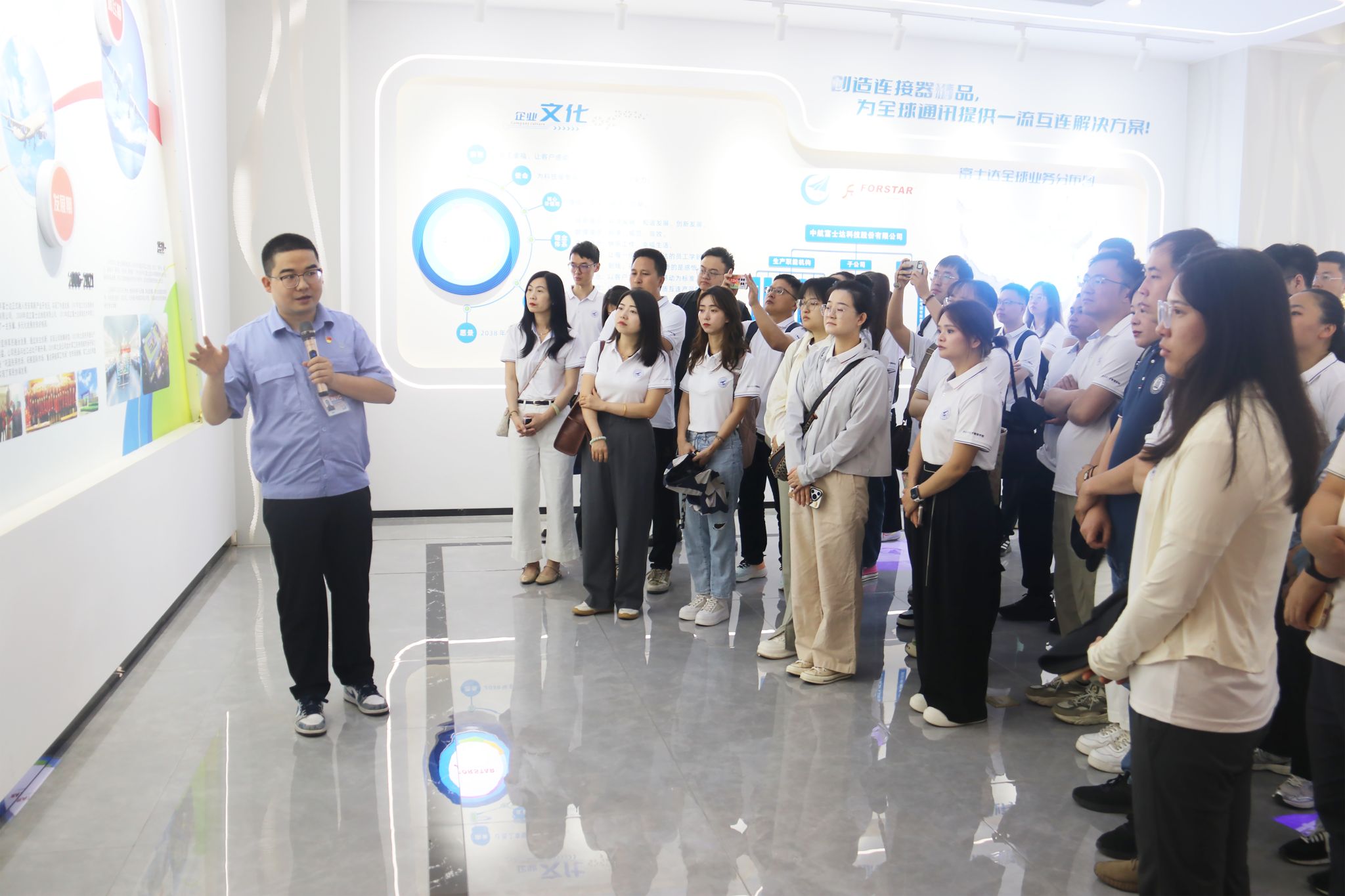 29日上午,访学团抵达中航富士达科技股份有限公司。acg漫画 郭云涛副院长和中行富士达党委副书记水莎共同为中航富士达作为acg漫画 的专业学位实践基地揭牌,并互赠纪念品。同学们参观了历史馆与产品展厅,并进入到生产制造、产品检验、技术研发等实验室和车间,参观一线平台运行实况,了解高科产品生产、检验等核心业务环节,听取实验室负责人讲解产品研发过程。