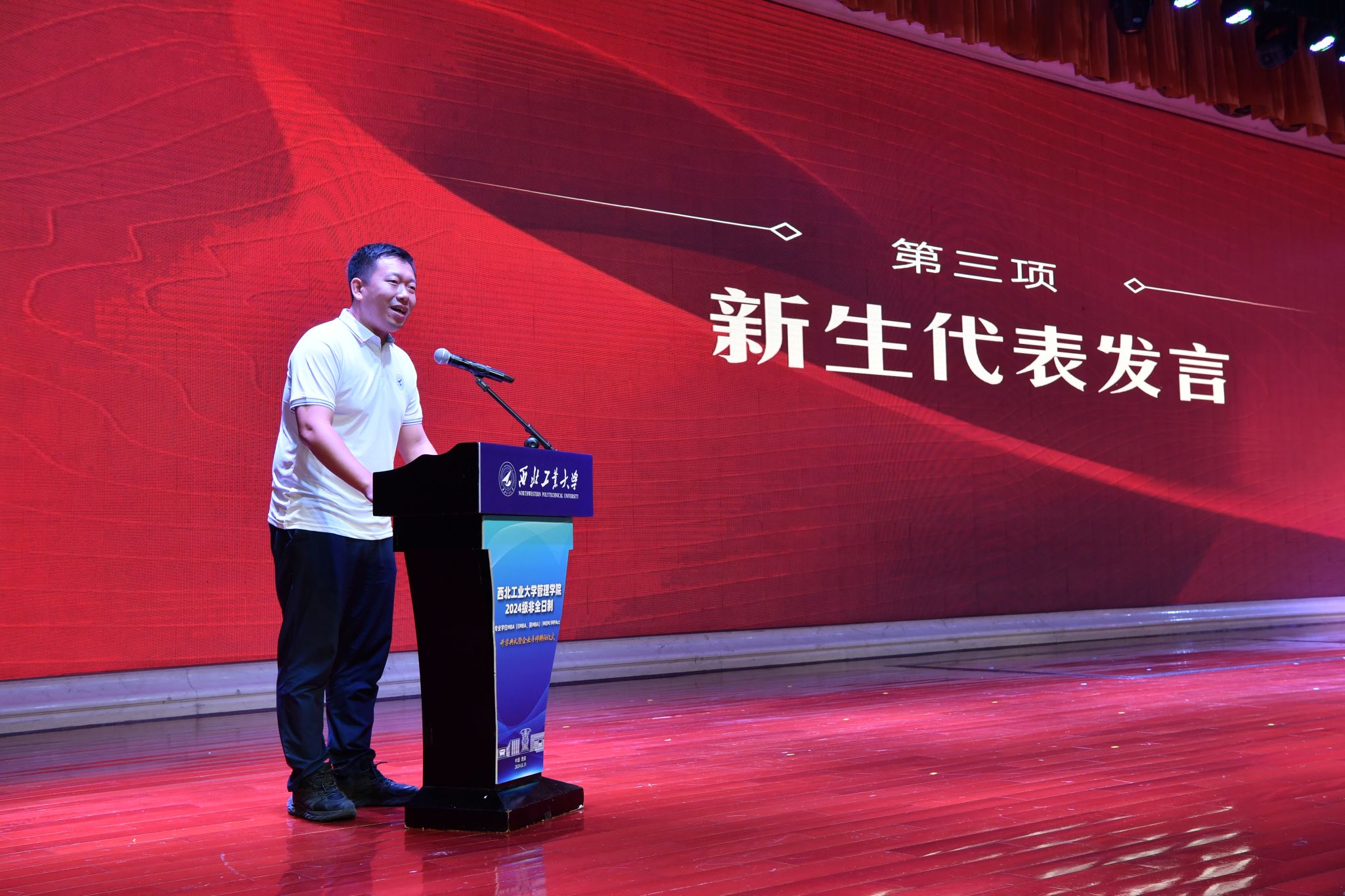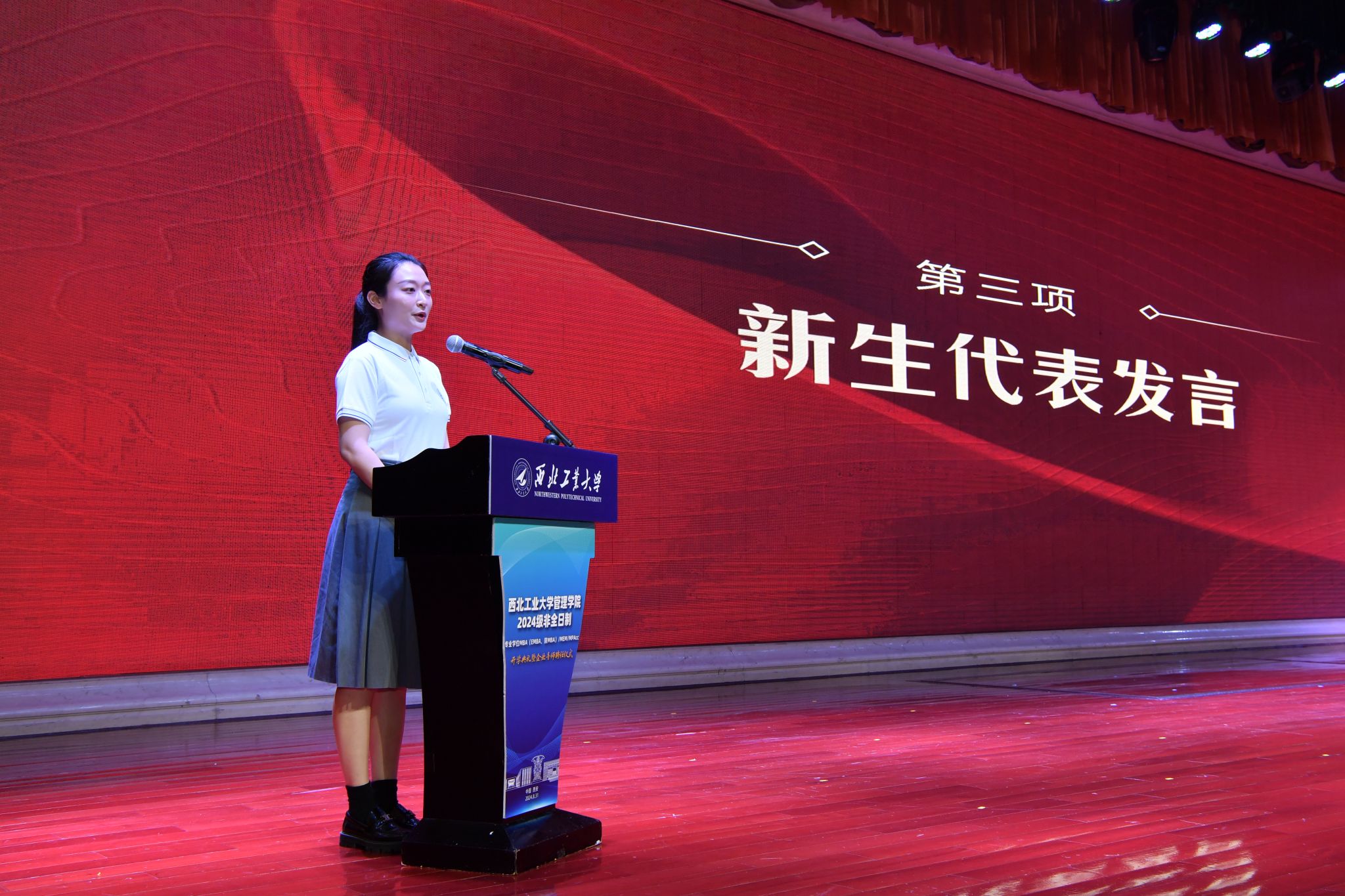2024级MBA新生代表广东中钞安达押运保安服务有限公司综合部副总经理高崇珊同学代表所有MBA新生表达了探索未知,敢于面对困难,不断突破自我,追求卓越的决心,希望大家携手并进,在西工大MBA的舞台上绽放光彩。