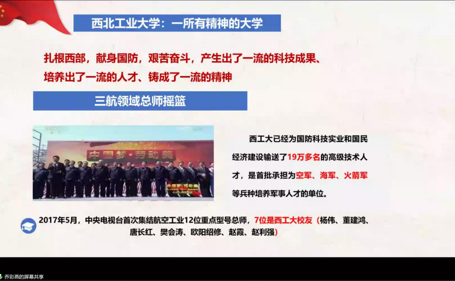 从民族危亡之际诞生、在艰苦抗战之中坚守、为国家发展之局西迁的伟大创举;也介绍了西工大参与重大项目研制,多次获得国家级荣誉,服务三航领域、服务国防建设的鲜明特色。三航文化感染着西工大人,献身国防,成就了三航领域总师摇篮,形成了独特的“西工大现象”。乔书记通过生动形象的讲解和细致感人的故事,使同学们深入认识到学校和学院厚重的历史积淀及文化底蕴,激发了强烈的认同感和归属感,大家倍感骄傲和自豪。