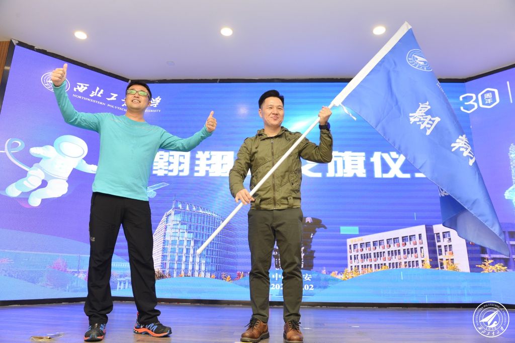党委书记乔彩燕为2020年在挑战赛中取得优异成绩的同学颁奖,翱翔队队长李浩同学将旗帜交予新任队长黎锦禄同学,标志着挑战赛的火种已点燃,预祝西工大翱翔队在赛场上取得更好成绩。