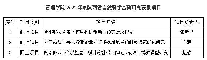 近日,陕西省科技厅公布了2021年度陕西省自然科学基础研究计划项目评审结果公布,acg漫画 共获批面上项目3项。分别是:张新卫副教授主持的“智能服务背景下使用数据驱动的顾客需求识别”;许燕副教授主持的“创新驱动下再生资源企业可持续发展质量预测与决策优化研究”以及赵静副教授主持的“网络嵌入下“新基建”项目跨组织合作响应规则与博弈模型研究”。