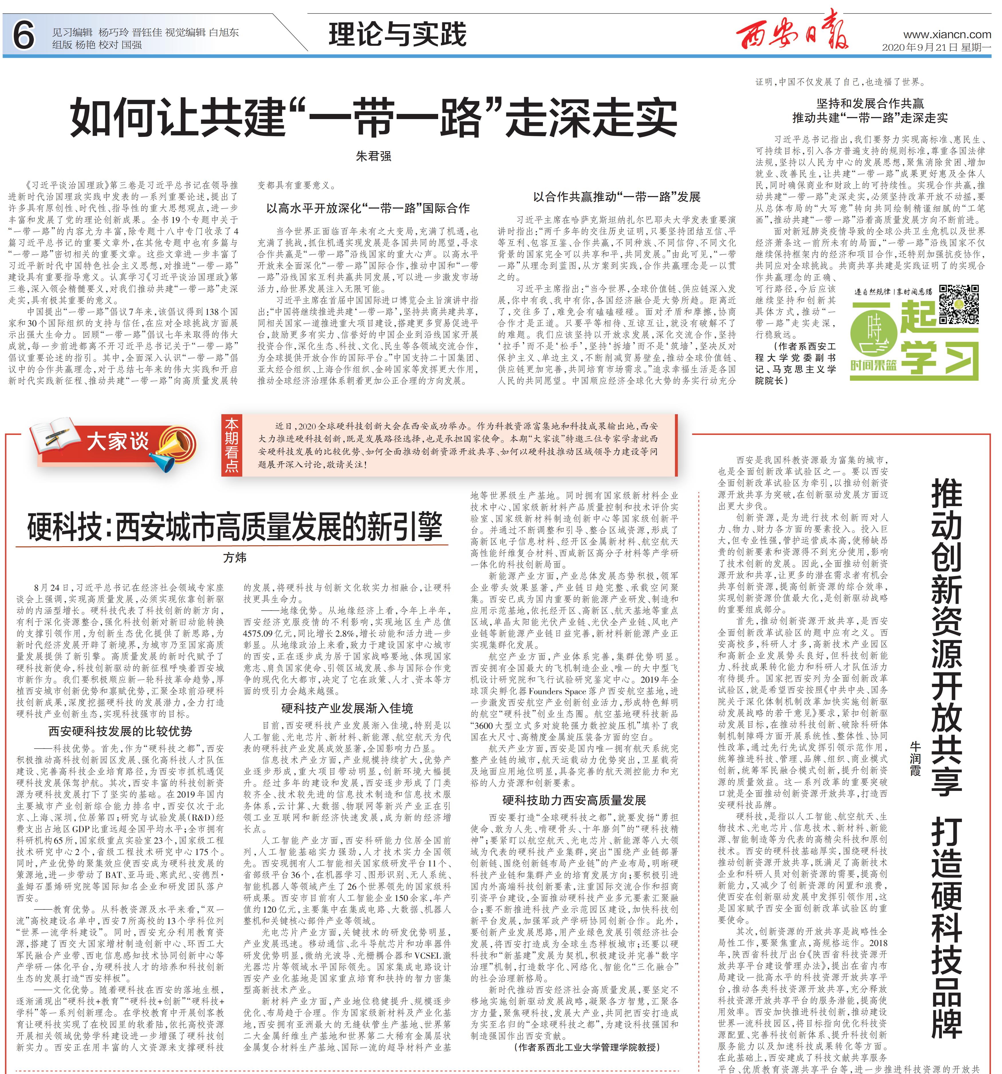 方炜教授撰写的理论文章——硬科技:西安城市高质量发展的新引擎。文章以本次大会的成功举办为契机,从几个“新”的角度阐述了硬科技对西安城市高质量发展的关键作用,硬科技代表了科技创新的“新”方向,为创新生态优化提供了“新”思路,为新时代经济发展开辟了“新”境界,为城市乃至国家高质量发展提供了“新”引擎;高质量发展的“新”时代赋予了硬科技“新”使命,科技创新驱动的“新”征程呼唤着西安城市“新”作为。文章从科技、教育、文化和地缘四个方面系统分析了西安市硬科技发展的比较优势,并总结了西安市以人工智能、光电芯片、新材料、新能源、航空航天为代表的硬科技产业发展方面做出的显著成绩。